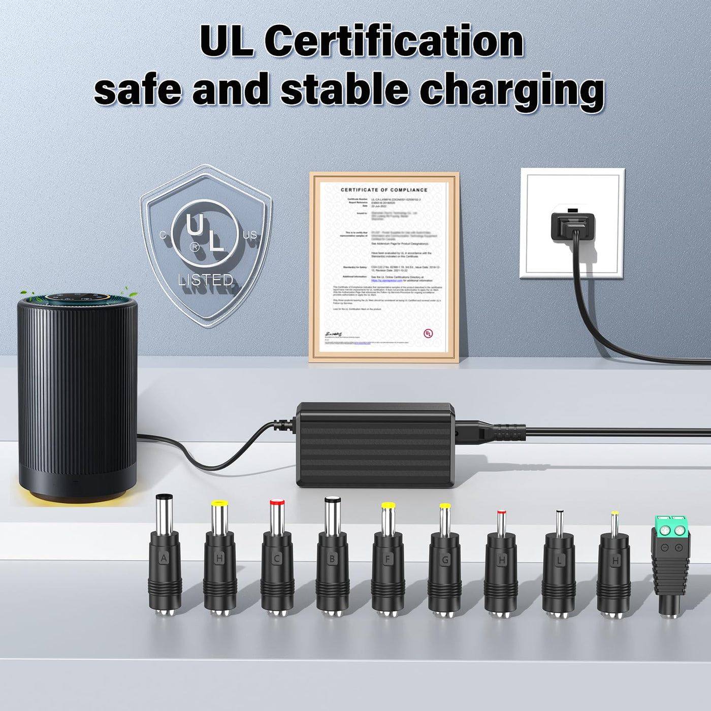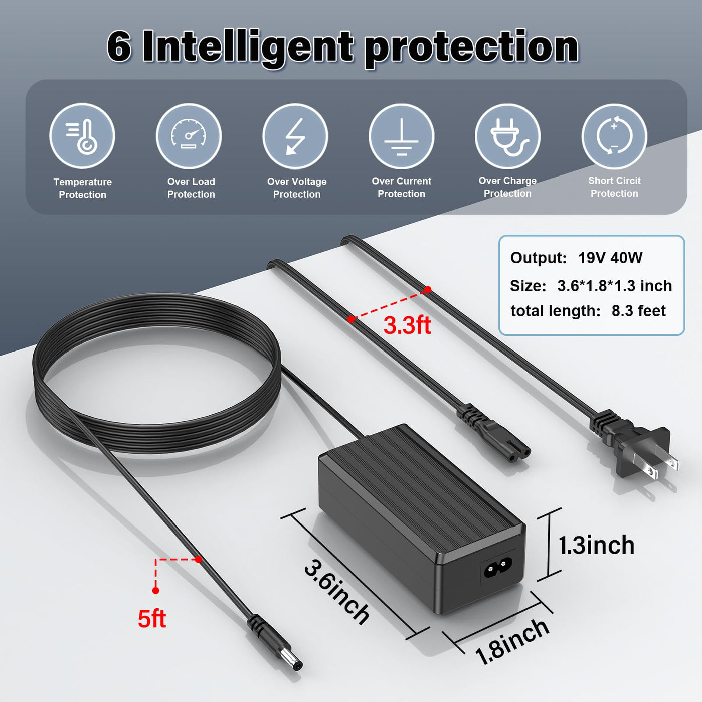 Ul Listed 19V 2.1A Power Adapter, Energy Efficiency Vi. Regulated 19.0V Power Supply Tested & Approved And Certified By Ul. Replacement Power Adaptor Build In Short Circuit/Over Current/Over Voltage/Over Temperature Protection, Safe Charging For Your 19V 2.1A Dc Max Input Devices. Charger Parameters Input: Ac 100-240V 50/60Hz. Output: Dc 19V 2.1A 39.9W Max Charger. Dc Jack: 5.5*2.1Mm. Cable Length: 6.0Ft Extra Long Power Cord. Weight: 6.5Ounce. Interchangeable Dc Tips Selected 10Pcs Various Connectors Which Can Be Used For Most Of Your 19V 2.1A Dc Input Devices. Interchangeable Dc Jacks Dimensions Please Double Confirm The Dc Jack Dimensions To Ensure The Compatibility. A: 6.0*4.4Mm With Pin Inside B: 6.3*3.0Mm. C: 5.5*2.5Mm. F: 4.8*1.7Mm. G: 4.0*1.7Mm. L: 3.0*1.1Mm. Green: Diy Connector. H-Yellow(Small One): 2.5*0.7Mm. H-Yellow(Big One): 5.0*1.0Mm With Pin Inside. H-Red: 3.5*1.35Mm. Dc Jack Of The Switching Power Supply: 5.5*2.1Mm. Will It Work With My Device? 1, Please Confirm Your Old Power Adapter Whether It Is 19V 2.1A 2.0A 1.5A... 2, Dc Jack Polarity: Inner Positive(+), Outter Negative(-). 3, Please Double Confirm Your Old Power Supply'S Dc Connector Dismensions Was Listed Above. Ps: These Answers Can Be Found On Your Old Power Adapter. What You Get 1 X 19V 2.1A 39.9W Max Ac/Dc Power Cord. 10 X Interchangeable Dc Jack.