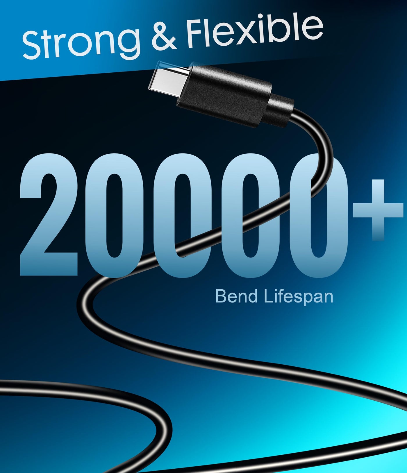 Q: What makes this charging cable more durable than others?A: This charging cable features a bold copper wire core wrapped in high-quality TPE, designed to withstand over 20,000 flex cycles, ensuring longer service life and durability compared to ordinary cables.