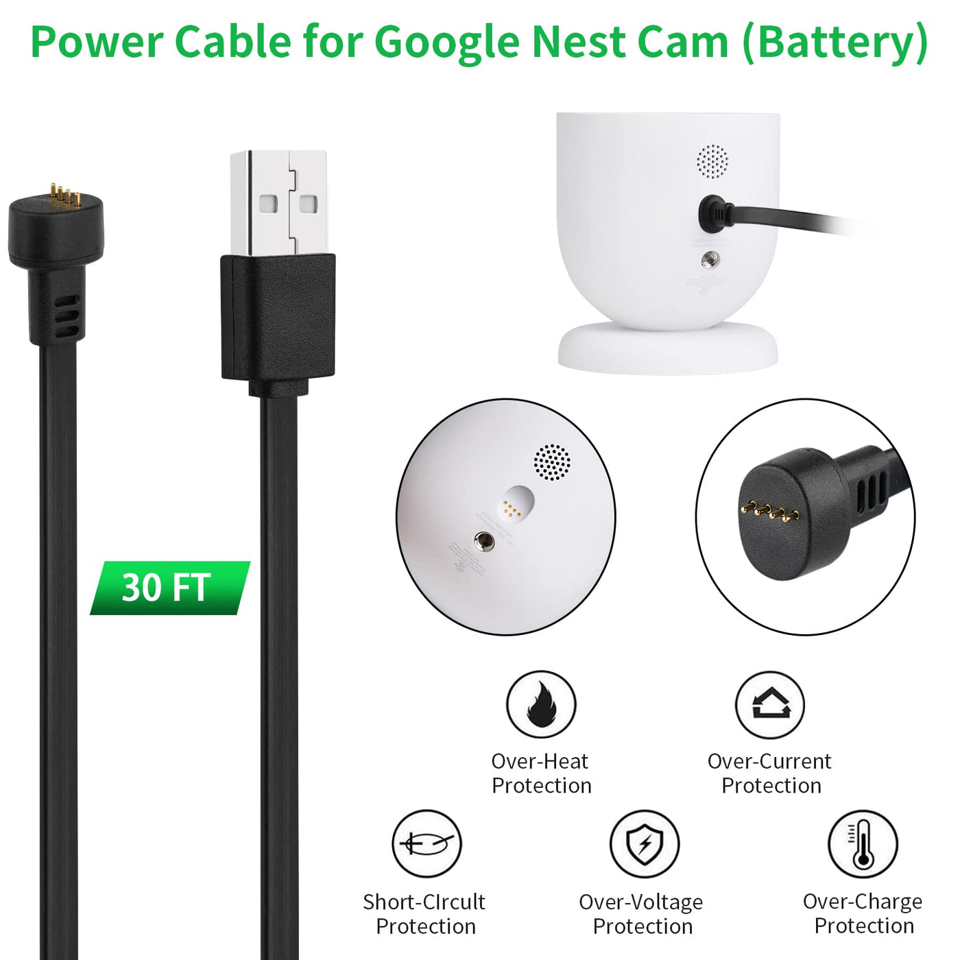 30Ft Weatherproof Charging Cable For Google Nest Cam Outdoor Or Indoor, Battery