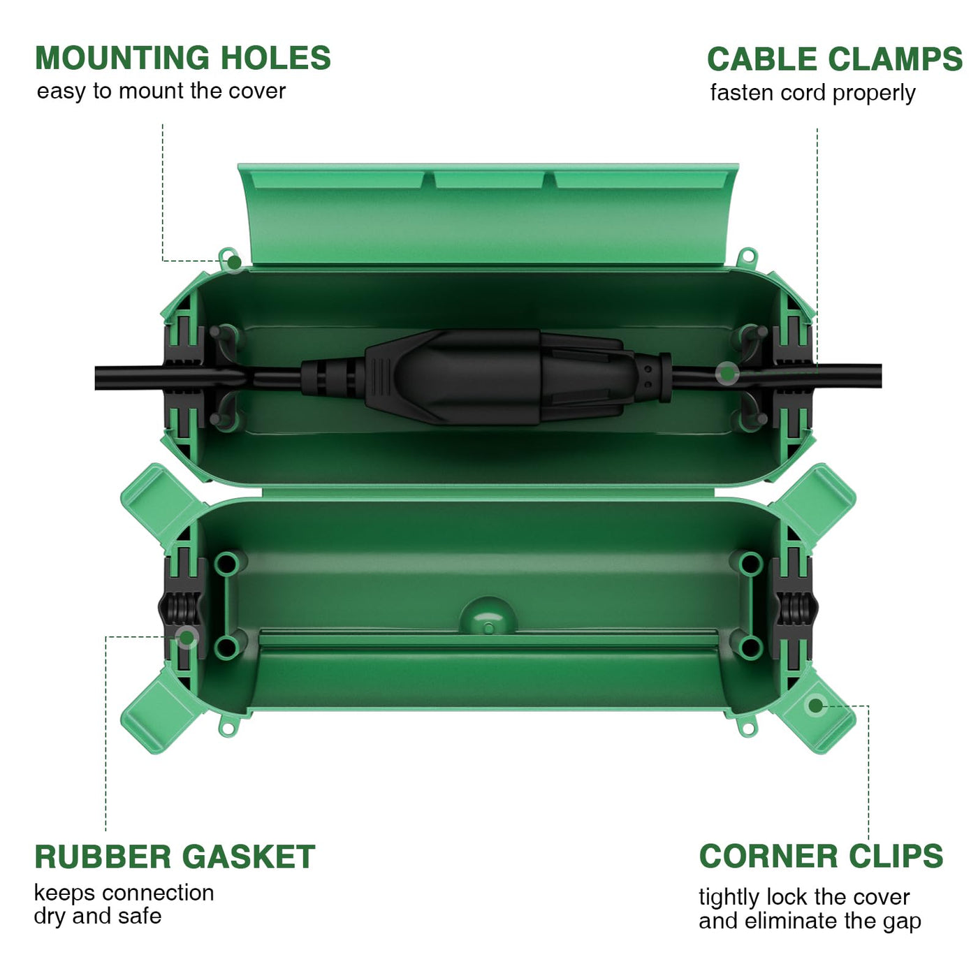 Installation: To Avoid Electric Shock, Turn Off The Power Switch Before Installation. Step 1: Open The Cover With The Snap-Lock Lid And 4 Corner Clips. Step 2: Place The Cord Connection And Fasten The Cord With The Clamps. Step 3: Close The Cover With The 4 Corner Clips And Snap-Lock Lid. Step 4: Place The Cover Properly For Protection. Note: The Package Comes With 2 Cable Ties. To Hang The Cover, Insert Them To The Side Holes And Fasten The Cable Ties On The Wall/Tree/Cord.