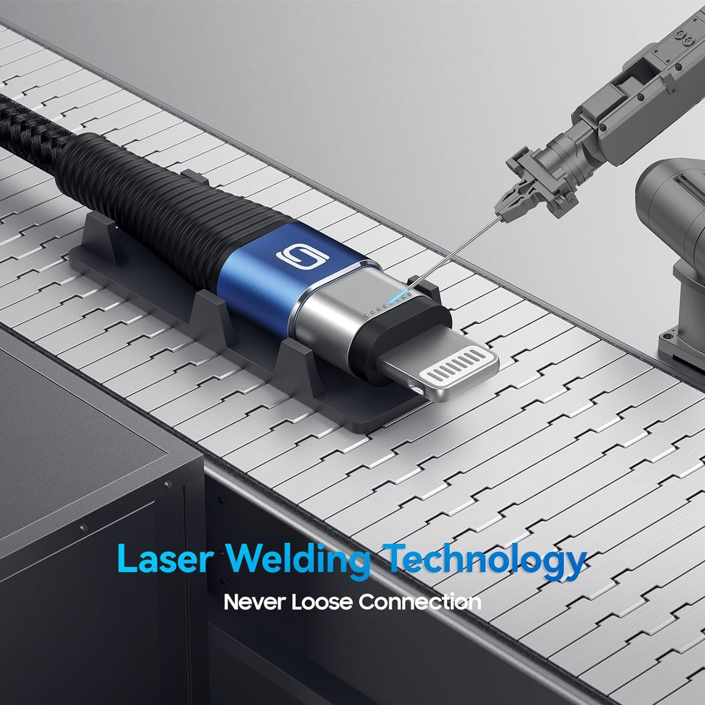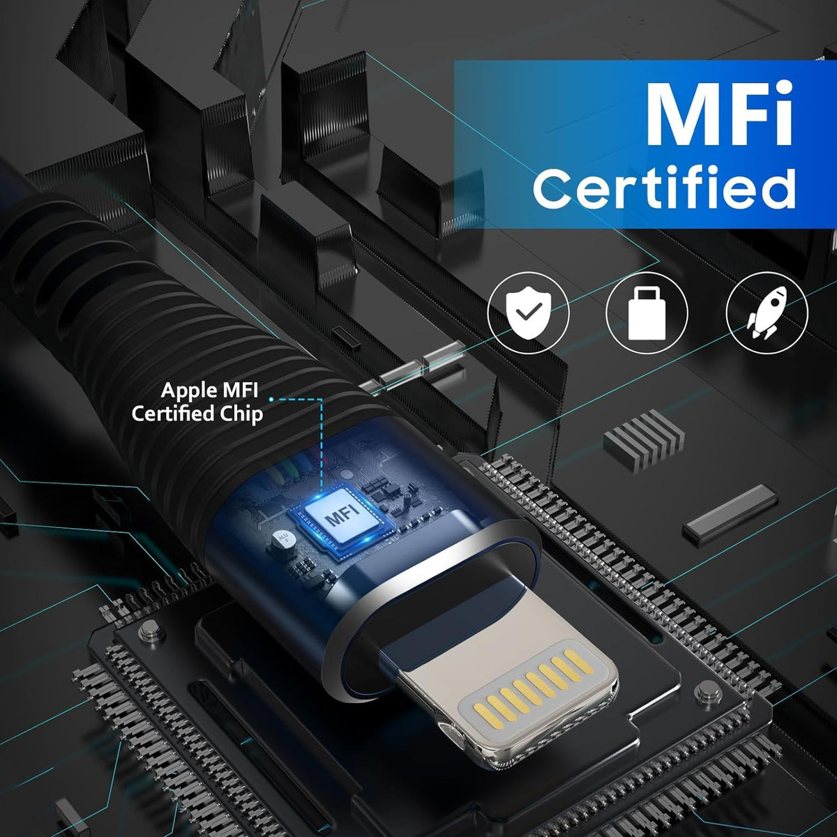 Q: What makes this charging cable MFi certified?A: The cable is MFi certified, which means it has been approved by Apple for use with its devices. It features a built-in intelligent chip that ensures 100% compatibility and safe charging.