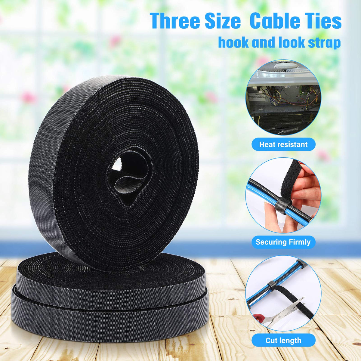 Q: What are the dimensions of the 3 Rolls Fastening Tape Cable Ties?A: Each roll of the fastening tape cable ties is approximately 10 yards in length. The rolls come in three different widths: 1 inch, 1/2 inch, and 3/4 inch, providing versatile options for various cable management needs.
