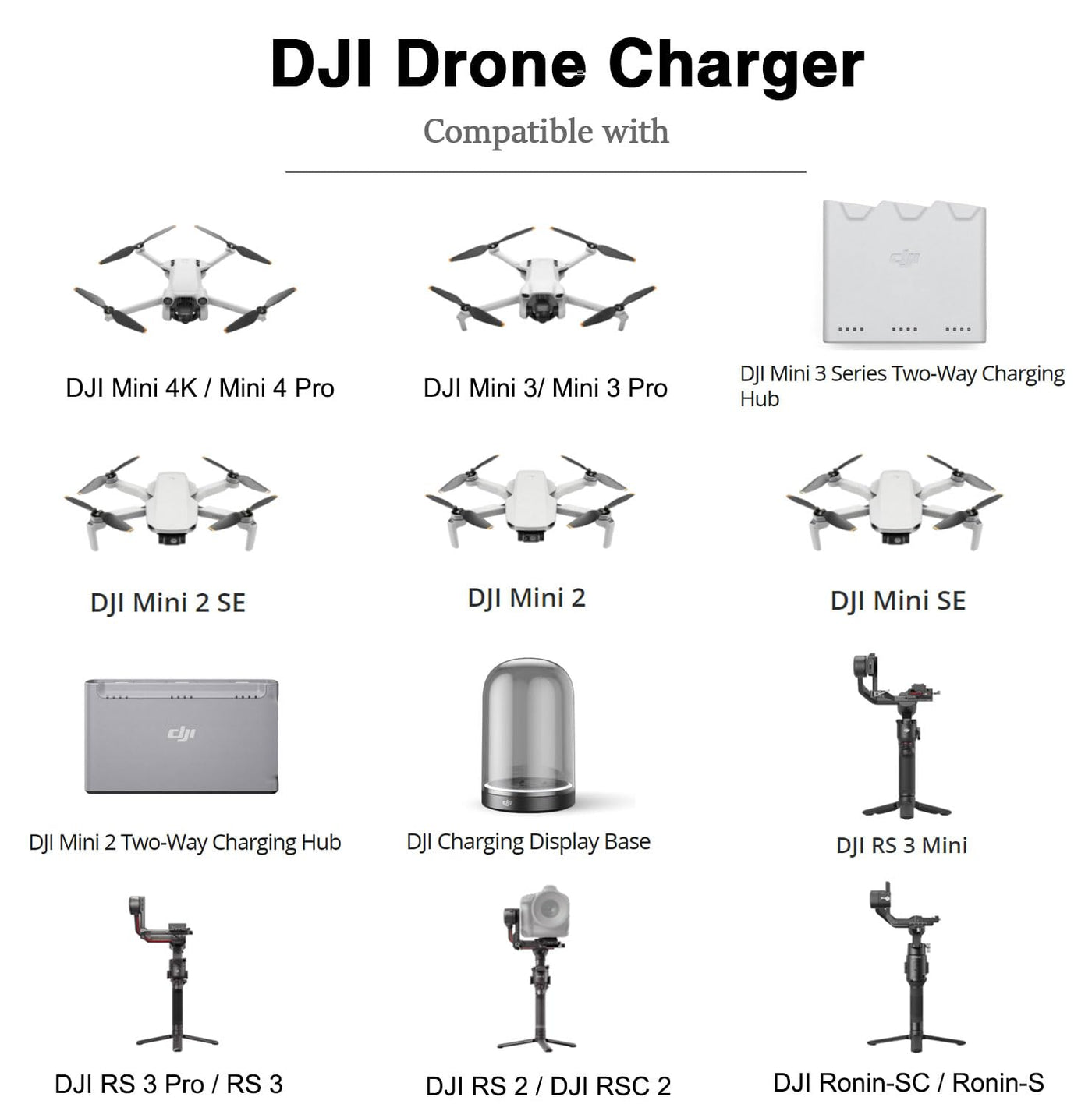 Q: Can I use this charger with DJI controllers and stabilizers?A: Yes, this charger is compatible with various DJI controllers, including the DJI RC and RC 2, as well as DJI stabilizers like the RS 3 Mini, RS 3 Pro, RS 3, RS 2, and RSC 2.