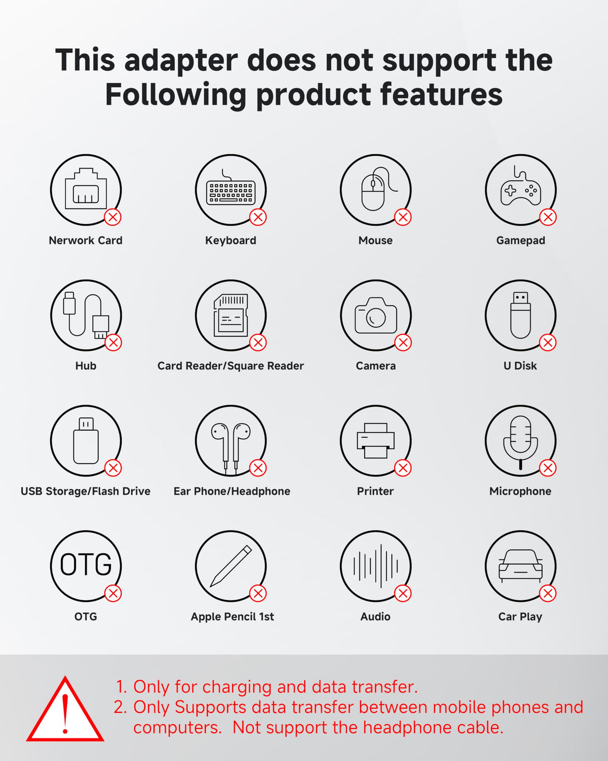 Q: Can this adapter support audio or headphone functions?A: No, the Lightning to USB C Adapter does not support audio, headphone, or OTG functions. It is designed solely for charging and data transfer.