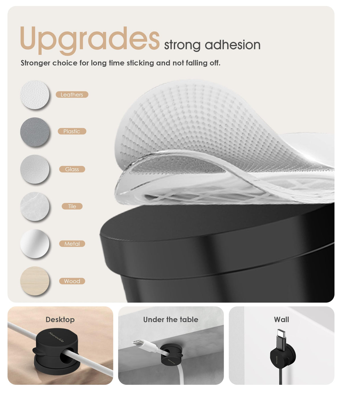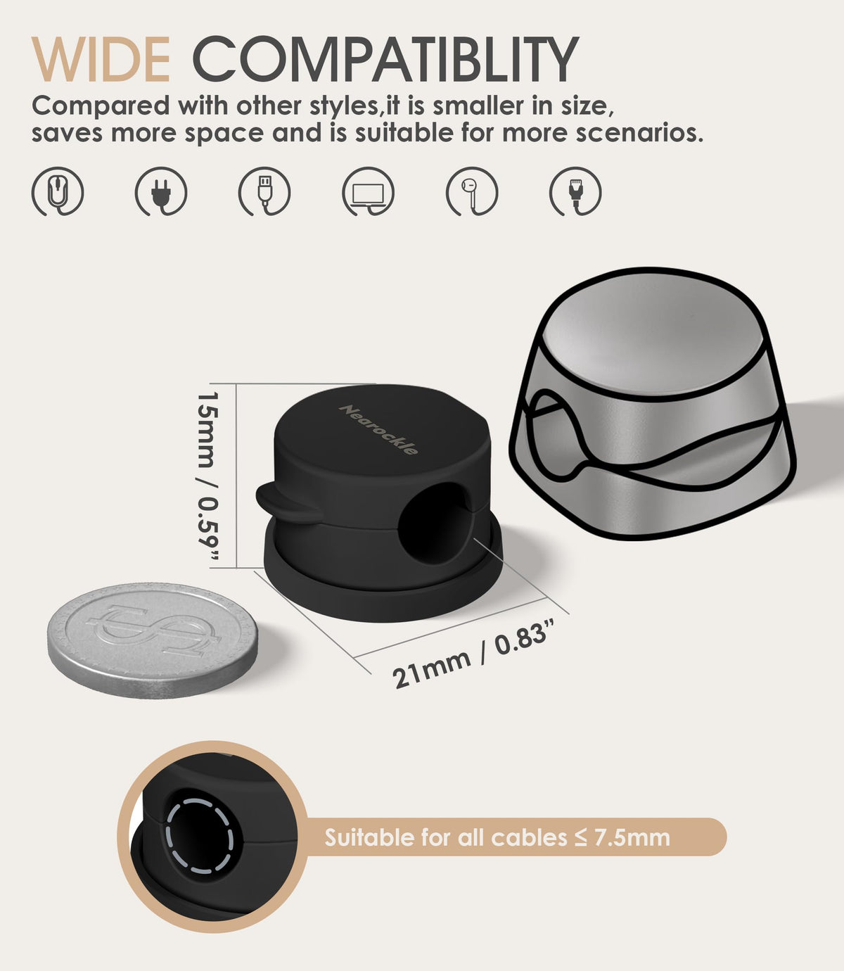 Q: Can the cable clips hold various types of cables?A: Yes, the Nearockle cable clips have a 7.5 mm diameter slot, which is suitable for holding most cables, including mobile phone charging cables, USB cables, and thick HDMI cables.