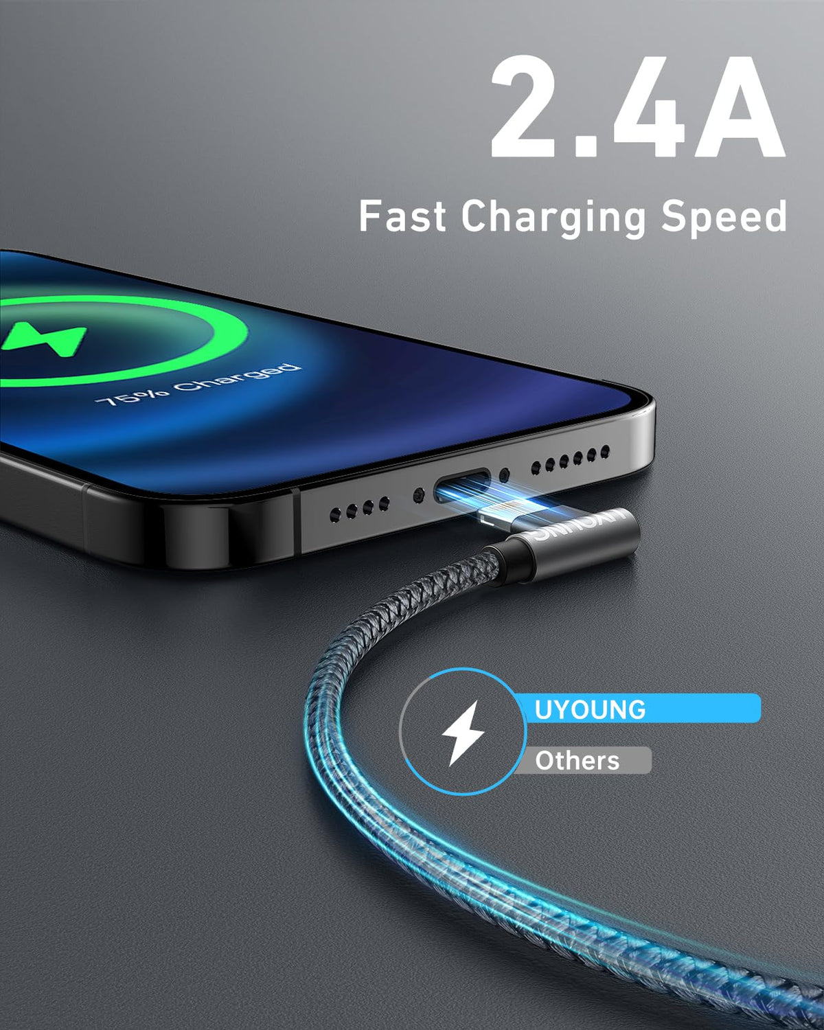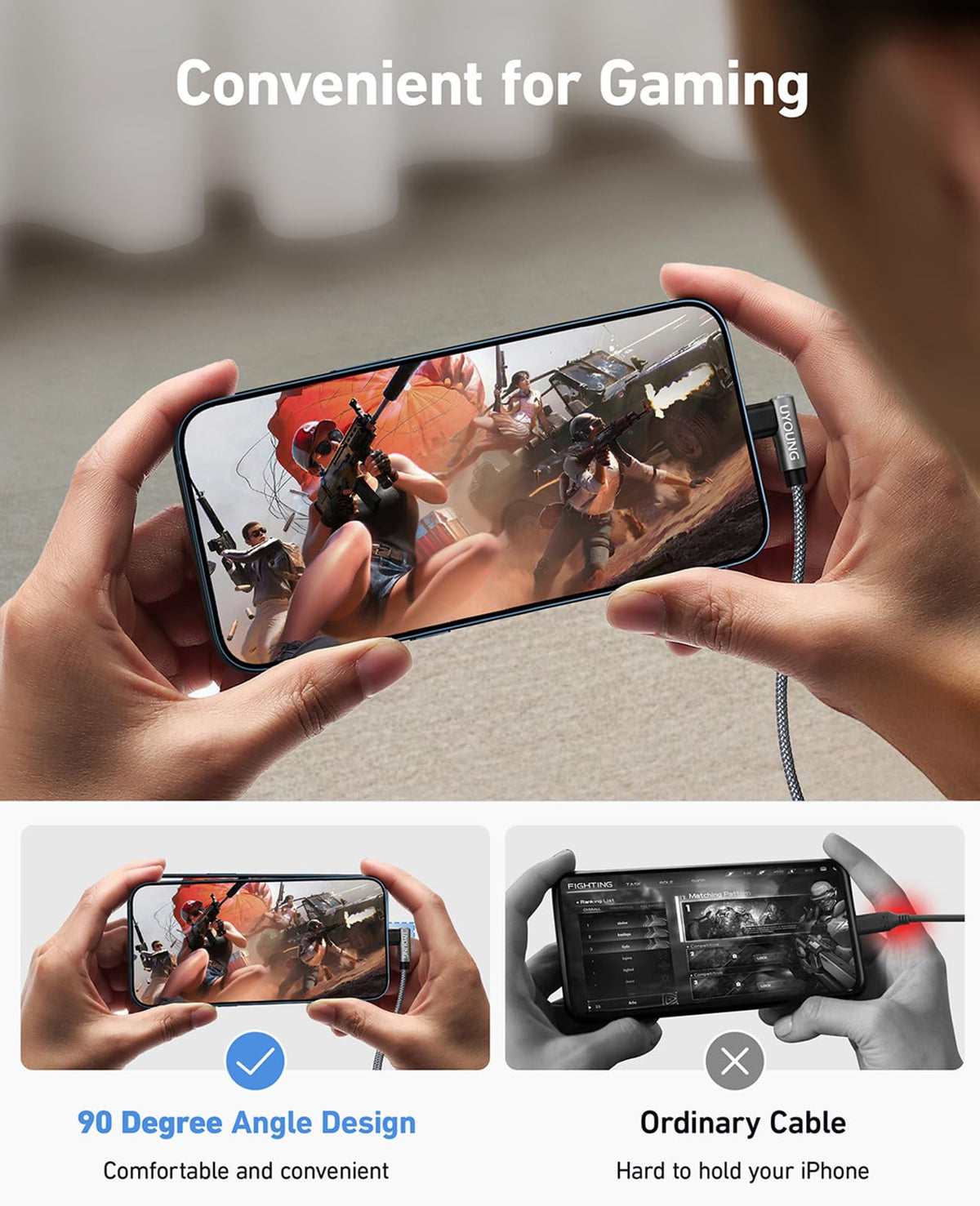 ?90 Degree Elbow Design?With Special 90 Degree Elbow Design, Right Angle Lightning Cable Could Provide You Great Convenience Of Playing Games Or Wacthing Video While Charging. Moreover, You Could Avoid Bending And Breaking The Cable Joints, Extends Its Service Life.