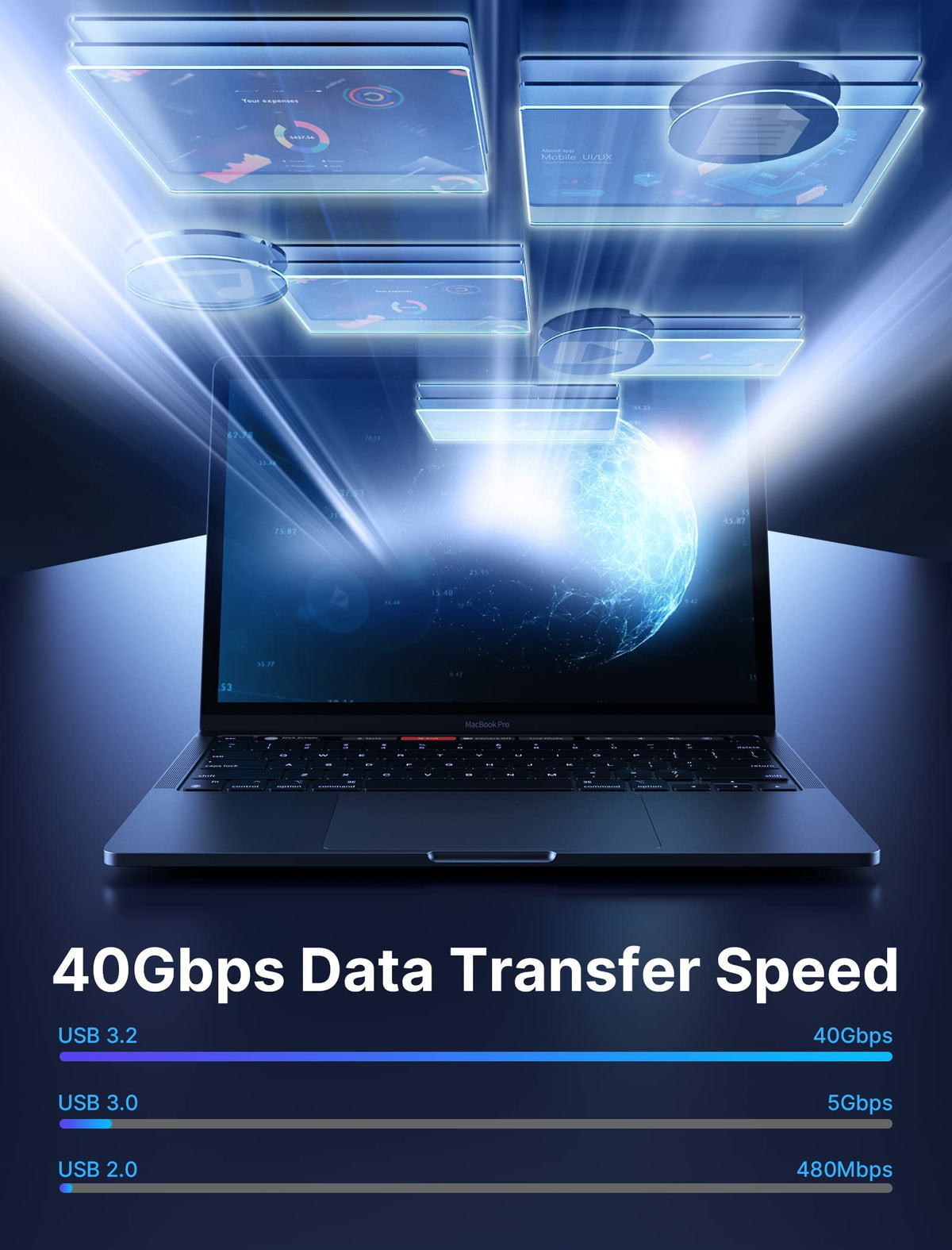 Q: What is the maximum data transfer speed of this USB-C adapter?A: This USB-C adapter supports data transfer speeds of up to 40Gbps, allowing for quick and efficient data transfer between your devices.