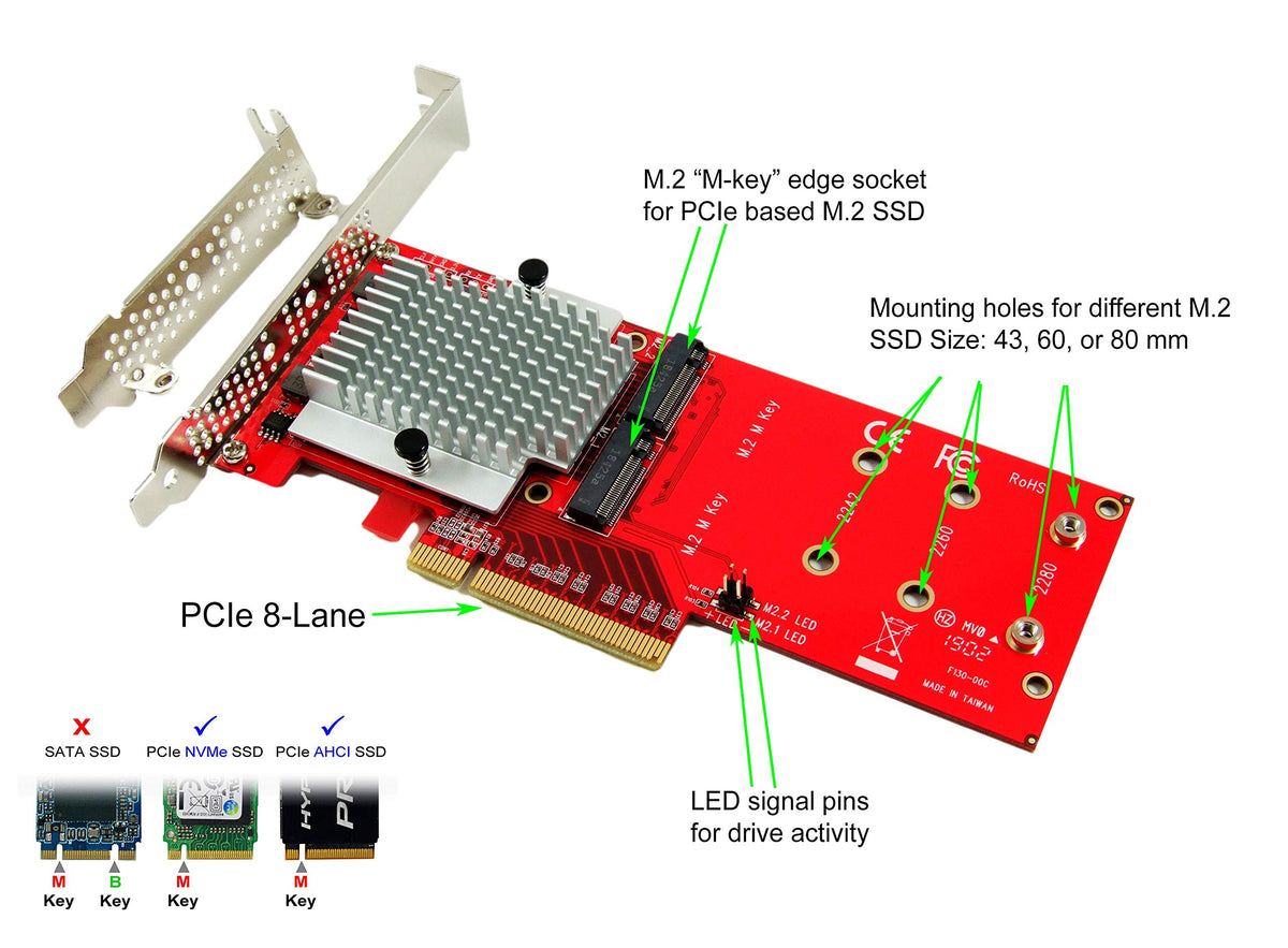 The Ableconn Pexm2-130 Allows You To Install Two M.2 Ngff Pcie (Ahci Or Nvme) Ssd On A Single Low Profile Pcie 3.0 X8 Card To Your Pc System. Features * Connector: - 2X M-Key (Type 2280-D5-M) M.2 Socket For M.2 Ngff Pcie Based Ssd - Pci Express X8 Male * Chipset: Asmedia Asm2824 Pcie 3.0 Switch * Software: - No Driver Installation Required. - Windows 10/8, Windows Server 2012 R2 And Later, Linux Series, Fedora, Suse, Ubuntu, Red Hat Native Drivers Support Both Pcie-Nvme And Pcie-Ahci * System Requirement: - An Empty Pcie 3.0 Or Pcie 2.0 X8, Or X16 Slot. * Pexm2-130 Does Not Rely On Pcie Bifurcation Supported By Cpu, Pch, Or Motherboard. It Supports Non-Bifurcation Motherboard. * Pci Express 3.0 X8 Lane Host Adapter Low Profile Form Factor Board With Both Regular Size And Low Profile Bracket Included * Movable M.2 Ngff Stand-Off And Multiple Plated-Holes Supports Type 2280, 2260 And 2242 M.2. Supports M.2 Ngff 80Mm, 60Mm, 42Mm Ssds. * Supports Dual-Sided M.2 Ssd Module With 1.5Mm Component Height On The Top And Bottom Side * Compliant With Pci Express 3.0 * Pin Header On Board For Drive Led Connection * Support L1 Power Management Substates With Clkreq * Fully Rohs Compliant * Made In Taiwan Note: Sata Based M.2 Ssd Module Can Not Work With This Pcie Based Adaptercan I Use It As Boot Drive? The Motherboard Bios Must Support Nvme Ssd And Support Booting From Pcie In Order To Boot From A M.2 Nvme Ssd On Pexm2-130. Compatibility (Incomplete List) * Samsung Xp941, Sm951 (Ahci Or Nvme), 950/960/970 Pro Series Ssds * Kingston Hyperx Predator M.2 * Plextor M6E Series M.2 Ssd * Intel 600P Ssd Series* Wd Blue Nvme Ssd Package Contents * Ableconn Dual M.2 Nvme Ssds Pcie X8 Carrier Adapter Card * 1X Low Profile Pcie Bracket * 2X Mounting Screw