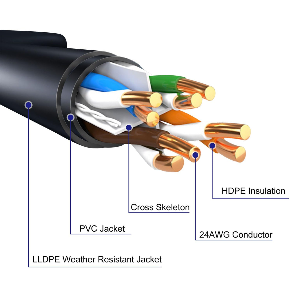 Q: Is this Ethernet cable suitable for outdoor use?A: Yes, this cable is specifically designed for outdoor use. It features a double jacket made of PVC and LLDPE, which provides waterproof, UV resistant, and corrosion-resistant properties, allowing it to withstand extreme weather conditions.