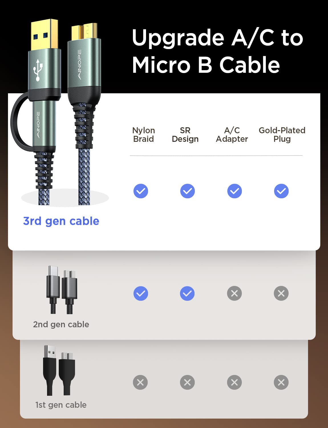 Ainope Micro 3.0 Cable, [New Upgrade] Usb A/C To Micro B Cable 3.3Ft/1M [Nylon Braided], Type A/C Male To Micro B External Hard