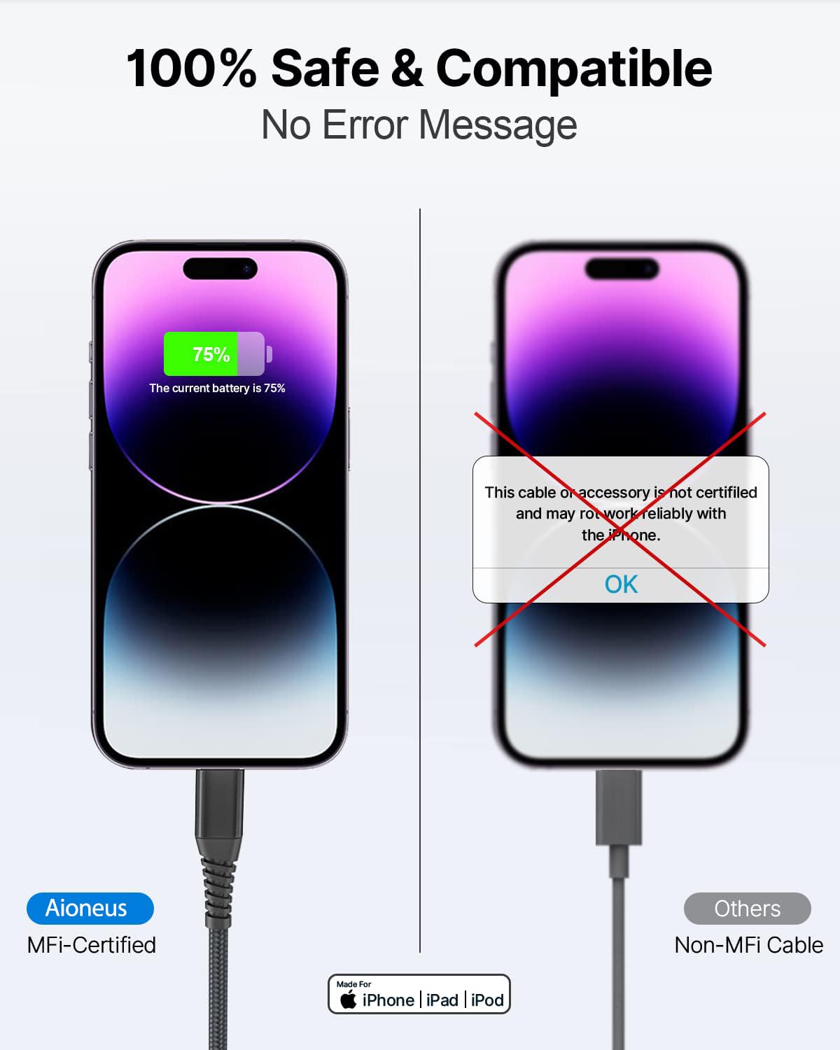 Aioneus 10Ft 2Pack Iphone Charger Fast Charging Cord Nylon Braided Usb Lightning Cable (Mfi Certified) Extra Long Cell Phone Cable For Iphone 14 13 12 11 Pro Max Xr Xs X 8 7Plus 6, (10 Feet)