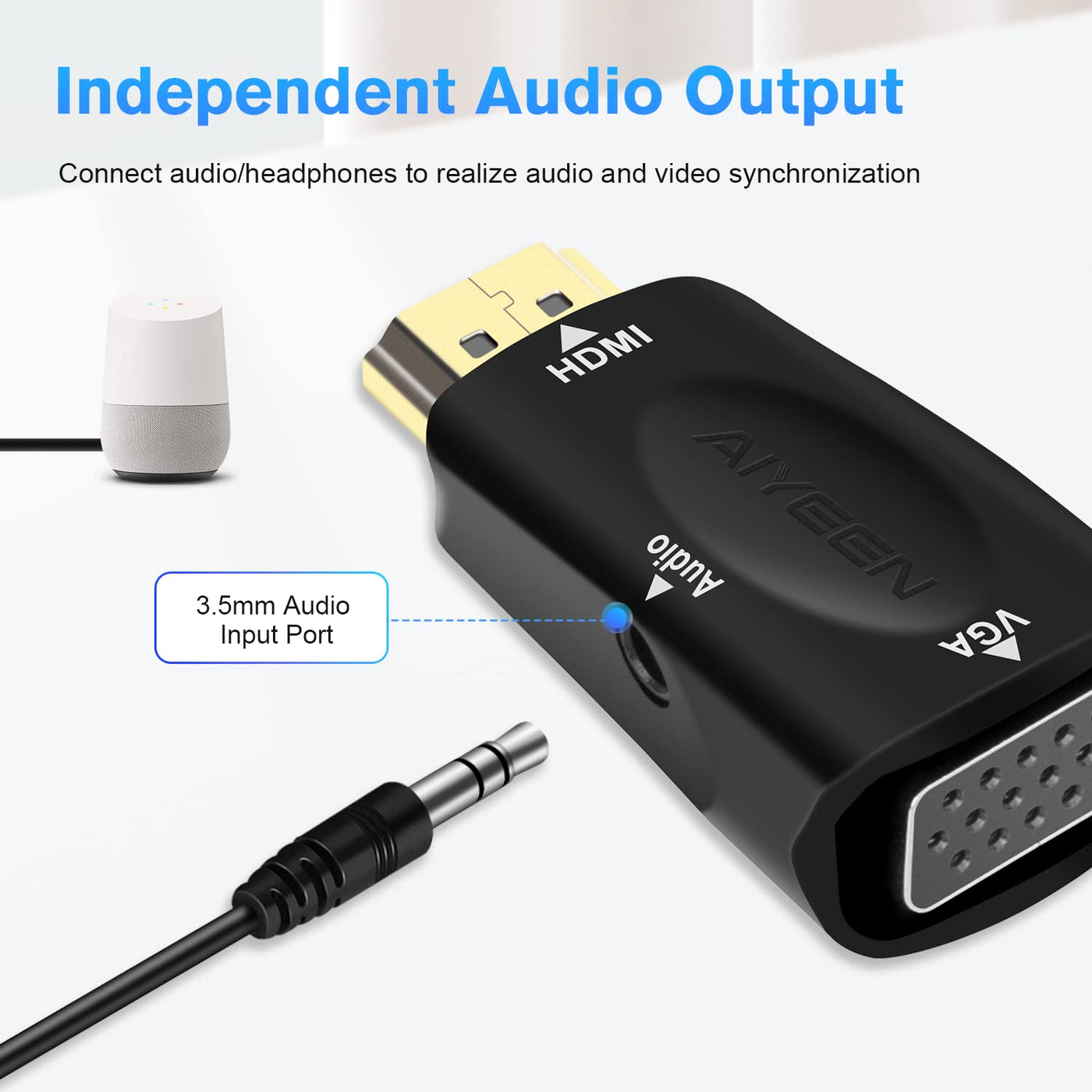 Aiyeen Hdmi To Vga Adapter, 1080P Hdmi Male To Vga Female Adapter With 3.5Mm Audio Jack Cable?Hdmi To Vga?Hdmi To Vga Converter Can Transmit From Hdmi Compatible Devices To Monitors Or Projectors With Vga Ports,Converting Vga+ Audio Output Via Hdmi Hd Digital Signal Input?Compact Design?The Hdmi To Vga Connector Is Gold-Plated To Resist Corrosion And Improve Signal Performance.Built-In Advanced Ic Chip Ensures Perfect Audio And Video Transmission?High Resolution?Hdmi Male To Vga Female Converter Supports Resolutions Up To 1920X1080 Full Hd,Including 720P And 1600X1200 For Monitors Or Projectors And Hdtvs?Wide Compatibility?This Hdmi To Vga Converter Is Compatible With Desktops, Laptops, Ultrabooks, Notebooks,Chromebooks, Cable Boxes, And Other Devices With Hdmi Ports?Note?It Is Unidirectional, Not Bidirectional,And Can Only Transmit Hdmi Digital Signal To Analog Vga