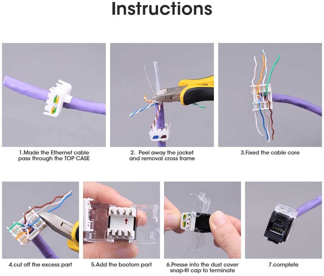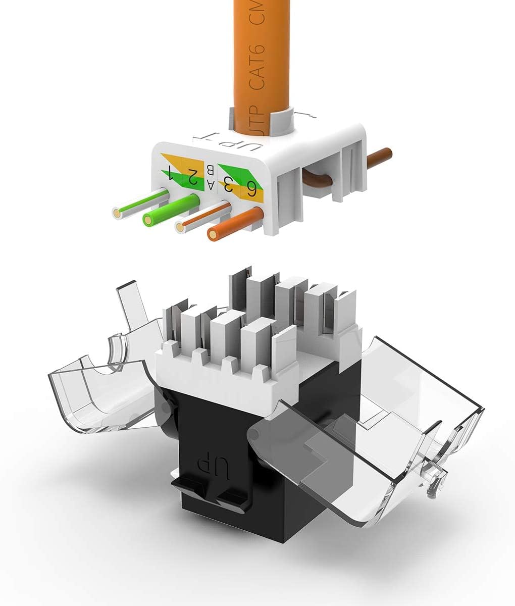 Self-Terminating, No Tool Required: This Toolless Utp Cat6 Keystone Jack Is A Female Rj45 Connector For Networking;The Cable Conductors Can Be Terminated By A 180 Degree Snap-Fit Cap Being Pressed Into Place, Designed To Smoothly Snap Into Most Of The Standard Keystone Applications | Housing Materials: Made With 50? Gold Plated Connector And Full Copper Conductor, Prevent The Corrosion Over Time; Abs Case For Fire Resistance; Features A Dust-Proof Shutter To Ensure Signal Transmission | Features: Cat 6 Performance To Future-Proof Your Network|Backwards Compatible To 10/100/1000 Mbps Ethernet Cat5 Cat5E Cat6. Complies With The Ansi/Tia/Eia 568-C.2 Standard; Labeled For T568A And T568B Wiring Scheme Next To Wire Clips; 110 Or Krone Type Termination Are Both Supportive; It Accepts 22 To 26 Awg Solid Ethernet Patch Cords | Applications: The Jack Is Compatible With A Wide Range Of Patch Panels, Surface Mount Boxes, Or Wall Plates (Face Plates). It Is Quite Versatile That Can Be Mounted With Different Type Of Keystones On A Same Plate | Packaging: 12 Pcs Cat6 Keystone Module Connector Per Bag