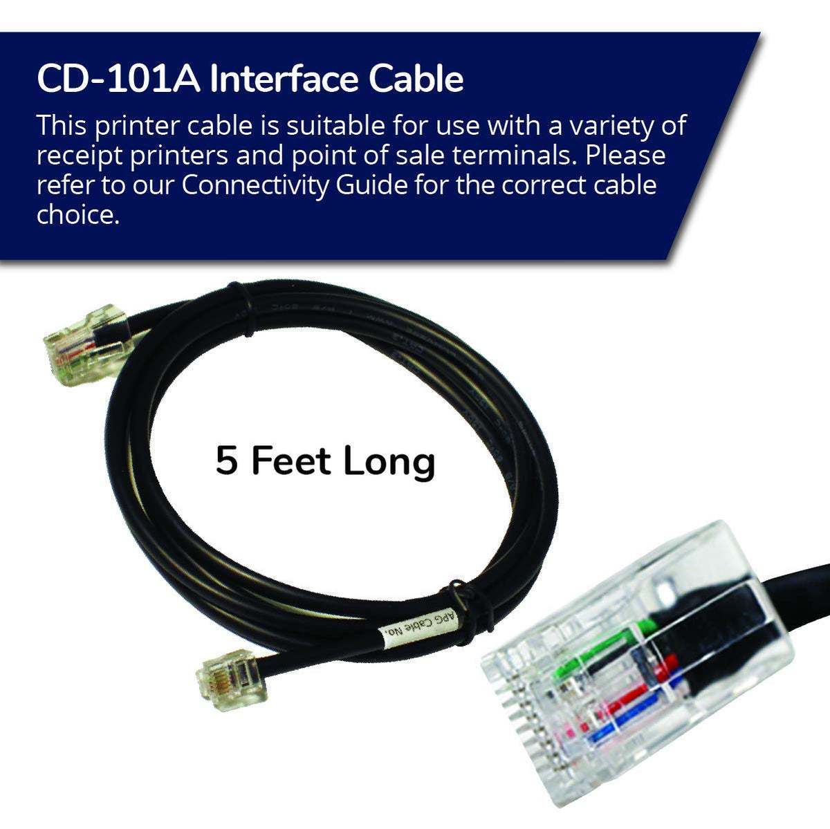The Apg Cd-101A Printer Cable Is Suitable For Connecting An Apg Cash Drawer With A Multipro 320 Or 520 Interface To A 24V Receipt Printer Or Point-Of-Sale Terminal For Creating An Integrated Point-Of-Sale System (Cash Drawer, Printer, And Terminal Sold Separately). The Cable Has An 8P8C (Rj45) Modular Plug At One End For Connecting To The Cash Drawer And A 6P6C (Rj12) Modular Plug At The Other End For Connecting To The Printer Or Terminal. It Measures 5' Long. This Printer Cable Is Suitable For Use With A Variety Of Receipt Printers And Point-Of-Sale Terminals. Apg Cash Drawer Manufactures Cash Drawers And Other Point-Of-Sale Equipment. The Company, Founded In 1978, Is Headquartered In Minneapolis, Mn.