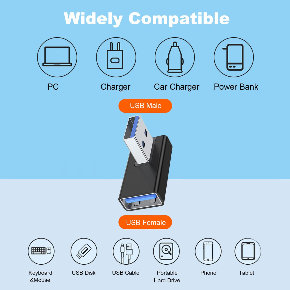 ?90 Degree Right Angle Design?The 90 Degree Right Angle Adapter Allows The Cable To Have A Suitable Direction, Which Can Avoid The Wear Of The Input Port Of The Device, Prolong The Service Life.(Please Note: The Adapter Points To The Right Only) ?High Speed Charging?The Adapter Supports The Maximum 5V/3A, 15W Power Delivery, Providing Your Device With The Fastest Possible Charging. ?5Gbps Data Transfer?The Usb 3.0 Adapter Can Provide Data Transfer Speed Up To 5 Gbps. Plug And Play, No Additional Drivers Needed. ?Small And Portable?Ultra Thin Size, Ultra Compact Design, Durable Aluminum Shell, Fine Appearance Details And Strict Quality Inspection Standards. ?Extensive Compatibility?For Pc, Laptop, Usb A Charger, Power Bank And More.