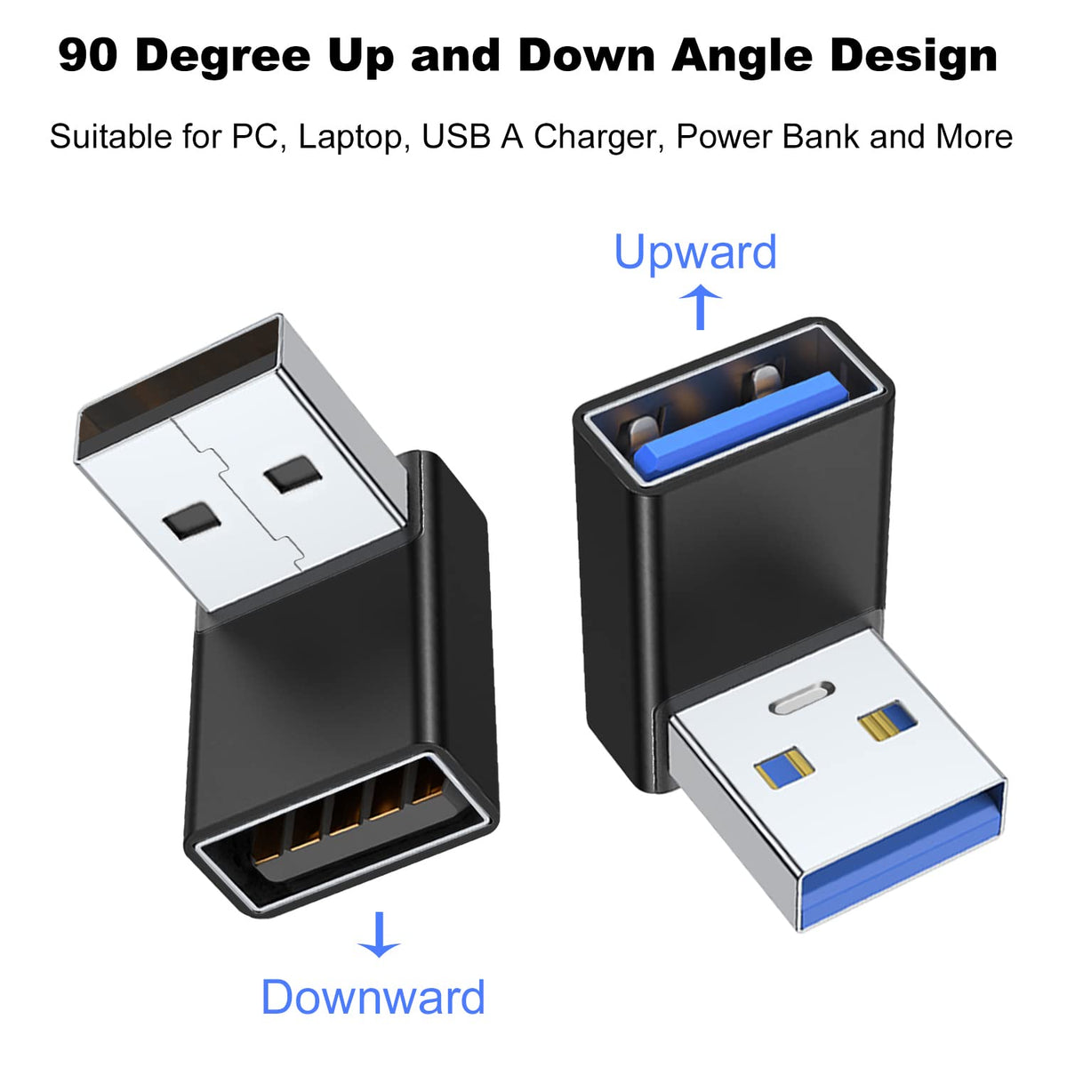 Areme 90 Degree Usb 3.0 Adapter 2 Pack, Up And Down Angle Usb A Male To Female Converter Extender For Pc, Laptop, Usb A Charger, Power Bank And More (Black)
