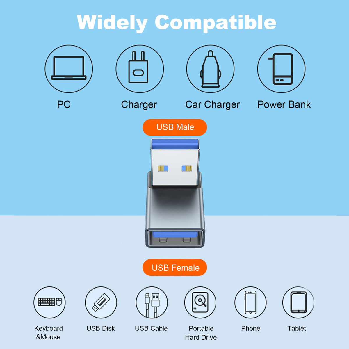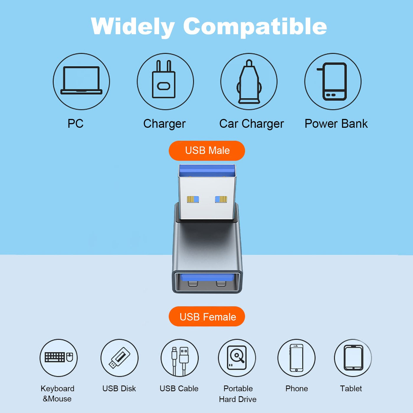 ?90 Degree Up And Down Angle?Up And Down Right Angle 90 Degree Design, Allows The Cable To Have A Suitable Direction, Which Can Avoid The Wear Of The Input Port Of The Device, Prolong The Service Life. ?High Speed Charging?The Adapter Supports The Maximum 5V/3A, 15W Power Delivery, Providing Your Device With The Fastest Possible Charging. ?5Gbps Data Transfer?The Usb 3.0 Adapter Can Provide Data Transfer Speed Up To 5 Gbps. Plug And Play, No Additional Drivers Needed. ?Small And Portable?Ultra Thin Size, Ultra Compact Design, Durable Aluminum Shell, Fine Appearance Details And Strict Quality Inspection Standards. ?Extensive Compatibility?For Pc, Laptop, Usb A Charger, Power Bank And More.