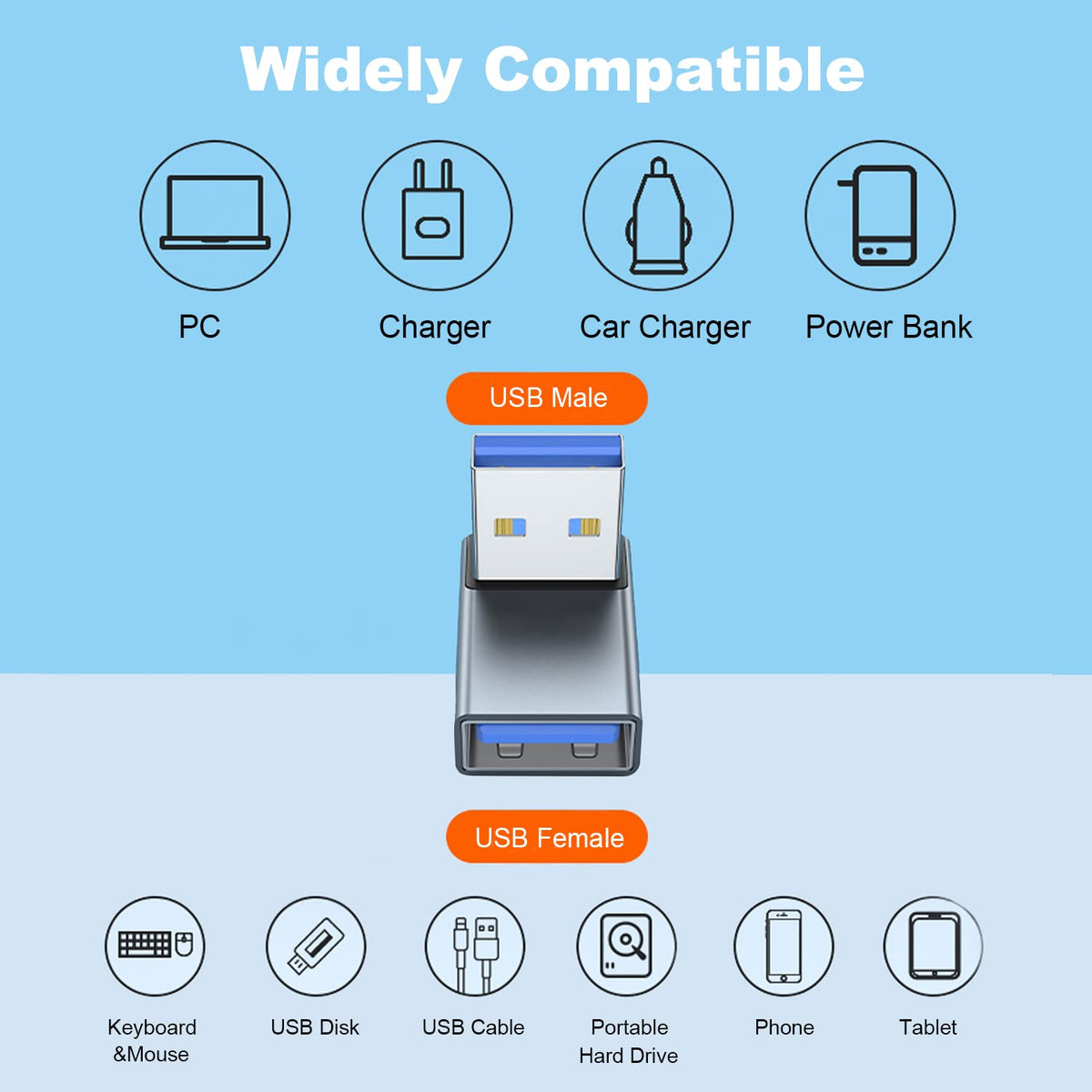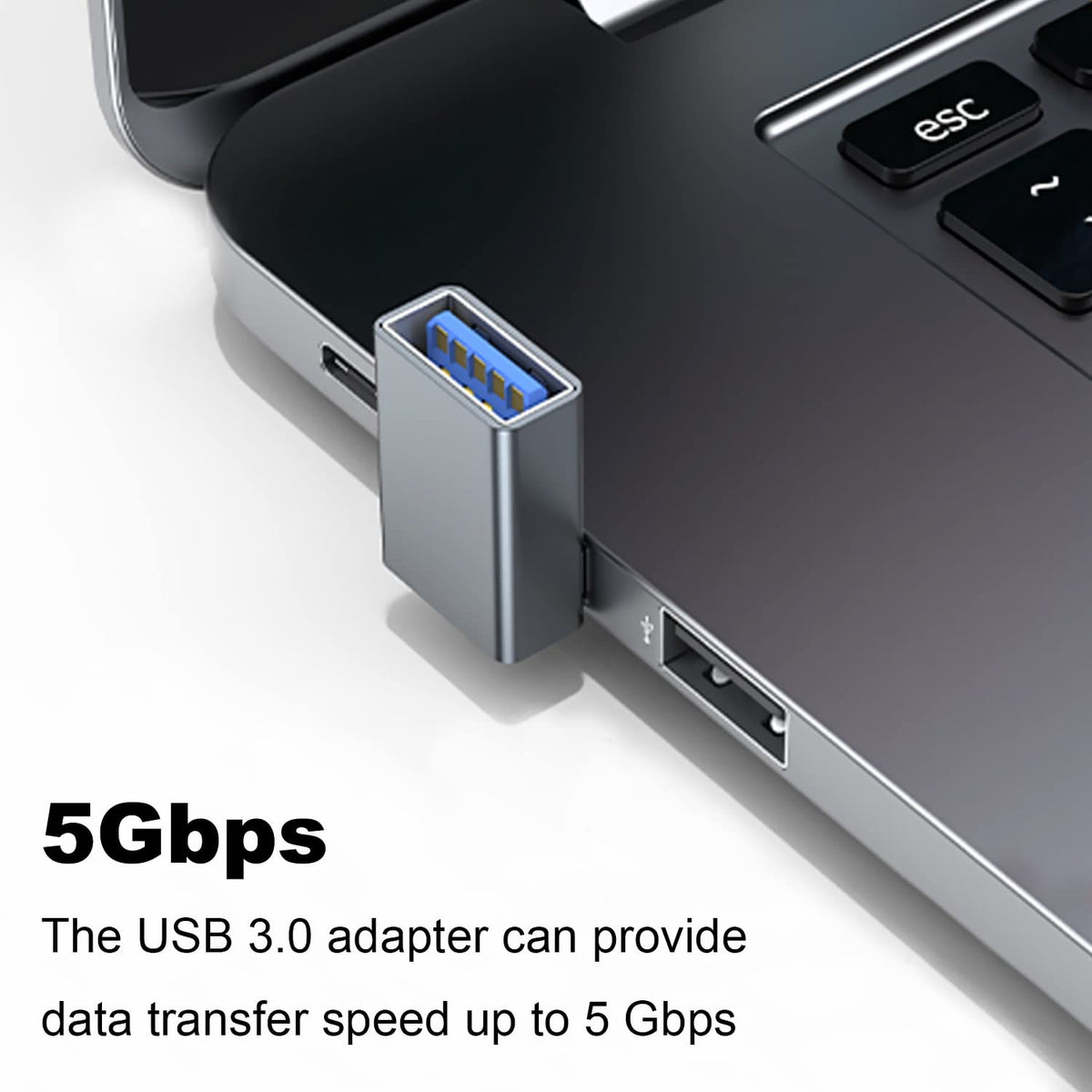 ?90 Degree Upward Angle?Upward Right Angle 90 Degree Design, Allows The Cable To Have A Suitable Direction, Which Can Avoid The Wear Of The Input Port Of The Device, Prolong The Service Life. ?High Speed Charging?The Adapter Supports The Maximum 5V/3A, 15W Power Delivery, Providing Your Device With The Fastest Possible Charging. ?5Gbps Data Transfer?The Usb 3.0 Adapter Can Provide Data Transfer Speed Up To 5 Gbps. Plug And Play, No Additional Drivers Needed. ?Small And Portable?Ultra Thin Size, Ultra Compact Design, Durable Aluminum Shell, Fine Appearance Details And Strict Quality Inspection Standards. ?Extensive Compatibility?For Pc, Laptop, Usb A Charger, Power Bank And More.