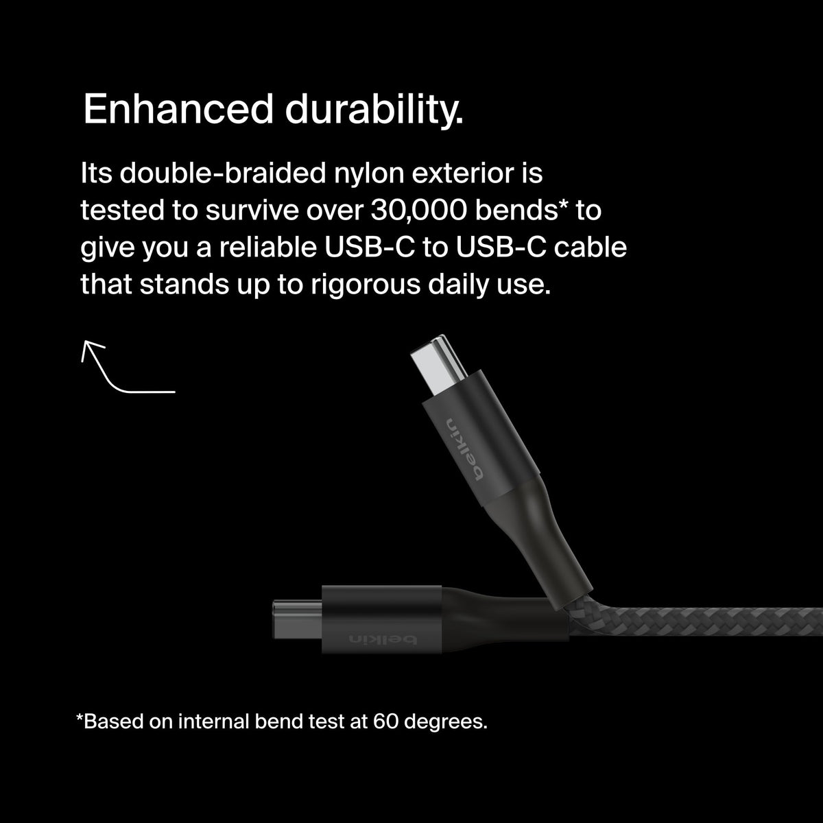 Q: How durable is the Belkin BoostCharge USB-C cable?A: The cable features a double-braided nylon design and an anodized aluminum cable head, tested to withstand over 30,000 bends and 10,000 plug-ins, ensuring long-lasting use.