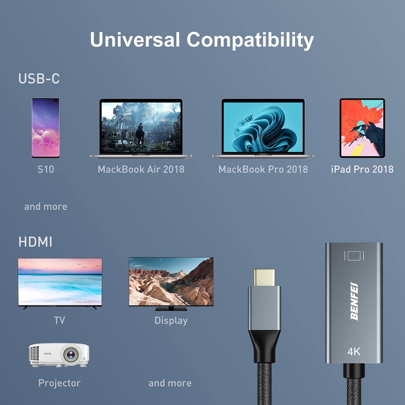 Compact Design - The Compact-Designed Portable Benfei Usb-C To Hdmi Adapter Connects A Computer, Desktop, Laptop, Or Other Devices With Usb-C Port To A Monitor, Projector, Hdtv, Or Other Devices With Hdmi Port; Tuck This Lightweight Gadget Into Your Bag Or Pocket To Do A Business Presentation With Your Laptop And Projector, Or Extend Your Desktop Screen To A Monitor Or Tv; | Superior Stability - Built-In Advanced Ic Chip Converts Usb-C Digital Signal To Hdmi Signal; Please Pay Attention, The Usb-C Device Should Support The Usb Type-C Dp Alt Mode. | Incredible Performance - The Usb-C To Hdmi Adapter Supports Resolutions Up To 3840*2160@60Hz Including 3840*2160@30Hz, 2K@60Hz, 1080P, 720P, 1600X1200, 1280X1024 For High Definition Monitors Or Projectors; Plated Usb-C Connector Resists Corrosion And Abrasion And Improve The Signal Transmission Performance; Molded Strain Relief Increases Cable Durability | Broad Compatibility - The Benfei Usb-C To Hdmi Is Compatible With 13''/15'' Macbook Pro 2021, 2020, 2019,2018,2017, Imac, Macbook, Macbook Air, Google Chromebook Pixel, Yoga 900, Dell Xps 13 (9350), Dell Xps 15 9550, Dell Xps12 9250, Dellprecision 5510, Hp Spectre X2, Hp Spectre X360, Hp Elitebook Folio G1, Hp Elite X2 1012 G1, Acer Switch Alpha 1, Acer Spin 7, Acer Chromebook R13, Samsung Chromebook Plus, Samsung Galaxy Tabpro S,Samsung Galaxy A7 2017, Lg G5, Lg V20, Htc 10 | 18 Month Warranty - Exclusive Benfei Unconditional 18-Month Warranty Ensures Long-Time Satisfaction Of Your Purchase; Friendly And Easy-To-Reach Customer Service To Solve Your Problems Timely Compare With Similar Items
