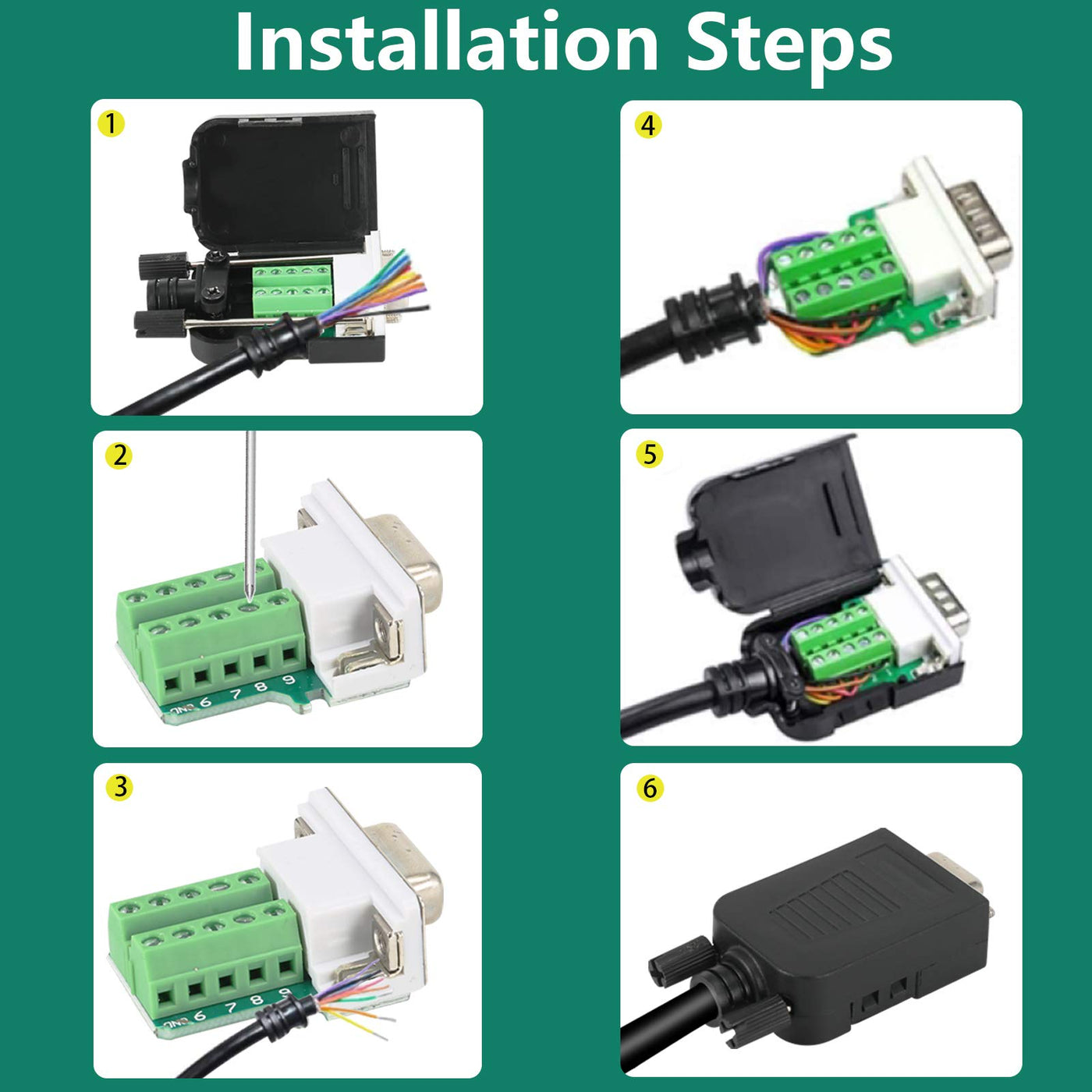 Parameter Pin: 9 Weight : 30G Design: Screw Type Color : Black & Green Contact Material: 4N Ofc Shell Type: Folding Snap-On Thickness: 16Mm/0.63Inch Name: Db9 Solderless Module Connector Type: 2*Male+2*Female Connector Material: Pure Copper Plated Joint Size : 47 X 34 X 16Mm/1.85'' X 1.34'' X 0.63''(L*W*H) Cable Hole Dia. : 5Mm/0.2'' 6Mm/0.236'' 7Mm/0.27'' Housing Material: Pp Engineering Materials Fixing Hole Diameter : 3Mm, Fixing Hole Center Distance : 6Mm/0. 236 Inch What You Get1 Screwdriver 8 X Screws 8 X Long Bolts 12 X Wire Cover 4 X Cable Pressing Plate 2 X Db9 Female Solderless Connectors With Case 2 X Db9 Male Solderless Connectors With Case