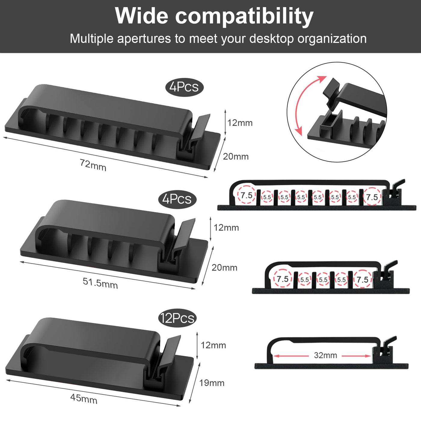 Long Service Life &Nbsp;&Nbsp; &Nbsp;&Nbsp; Cable Management Clips Are Suitable For Many Multi-Scenes, In Addition To Wire Organization Can Also Complete The Decorative Arrangement. The Clips Made From An Upgraded Version Of The Adhesive And Premium Plastic, Are Used To Avoid Sun Exposure And Moisture For Extended Service Life Installation Steps &Nbsp;&Nbsp;&Nbsp; 1. Wipe Clean The Plane That Needs To Be Pasted And Keep It Dry. &Nbsp;&Nbsp;&Nbsp; 2. Tear Off The Sticker Behind The Clamp And Paste It On The Place At The Angle You Want. &Nbsp;&Nbsp;&Nbsp; 3. Press Several Times To Keep It Tightly Pasted And Wait 24 Hours. &Nbsp;&Nbsp;&Nbsp; 4. Open The Clip And Put It In The Table And Close The Clip. Package: &Nbsp;&Nbsp;&Nbsp; 12 X Cable Clips &Nbsp;&Nbsp;&Nbsp; 4 X Small Desk Wire Clips &Nbsp; &Nbsp; 4 X Large Desk Wire Clips