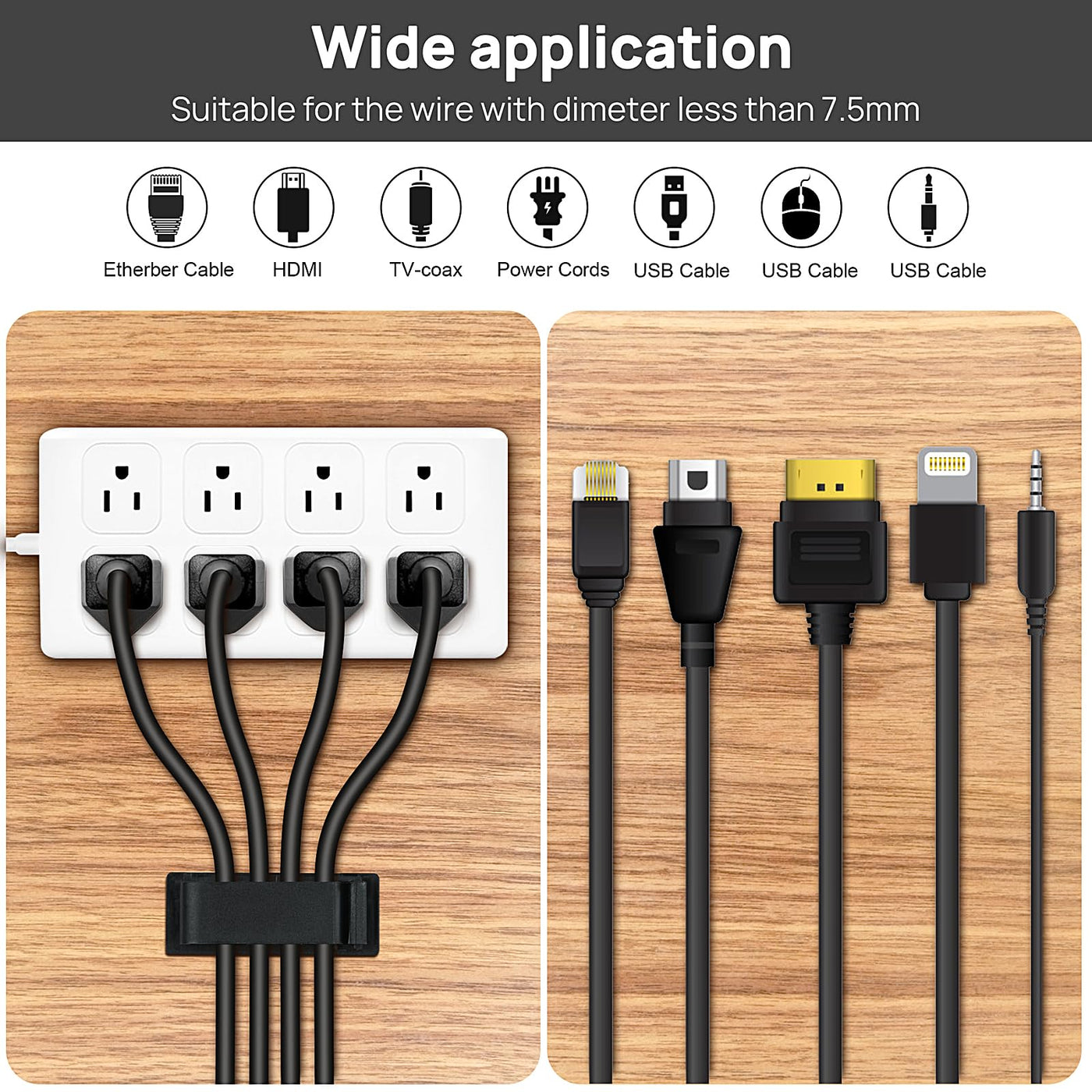 Q: Can these clips be used for different types of cables?A: Yes, the Halsouy Cable Management Clips are versatile and can be used for various types of cables including power cords, charging cables, CAT-6 cables, USB cords, and laptop power cables, making them perfect for home, office, and car use.