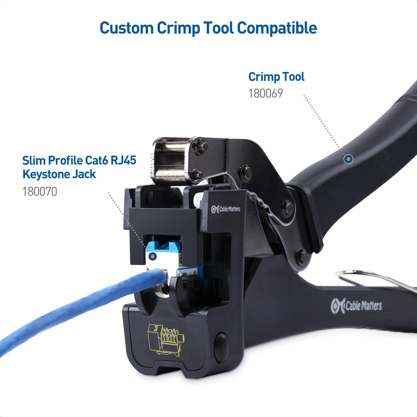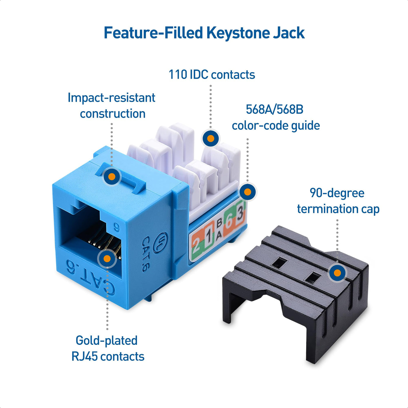Keystone Jack Convenience in a Slim Package The Cable Matters Slim Profile 90-Degree Cat 6 RJ45 Keystone Jacks can be used with 23 or 24 AWG solid cable into patch panels, wall plates, or surface mount boxes with standard or slim keystone blanks. An easy snap-in retaining clip ensures a secure connection. The 110-type terminations are color-coded with both T568A and T568B wiring schemes. The IDC modules accommodate 110 impact tools and include dust caps that assist with cable strain relief. Constructed of high-impact, fire-retardant plastic with gold-plated contacts, these keystone jacks meet or exceed Category 6 performance in compliance with the ANSI/TIA/EIA 568-C.2 standard.