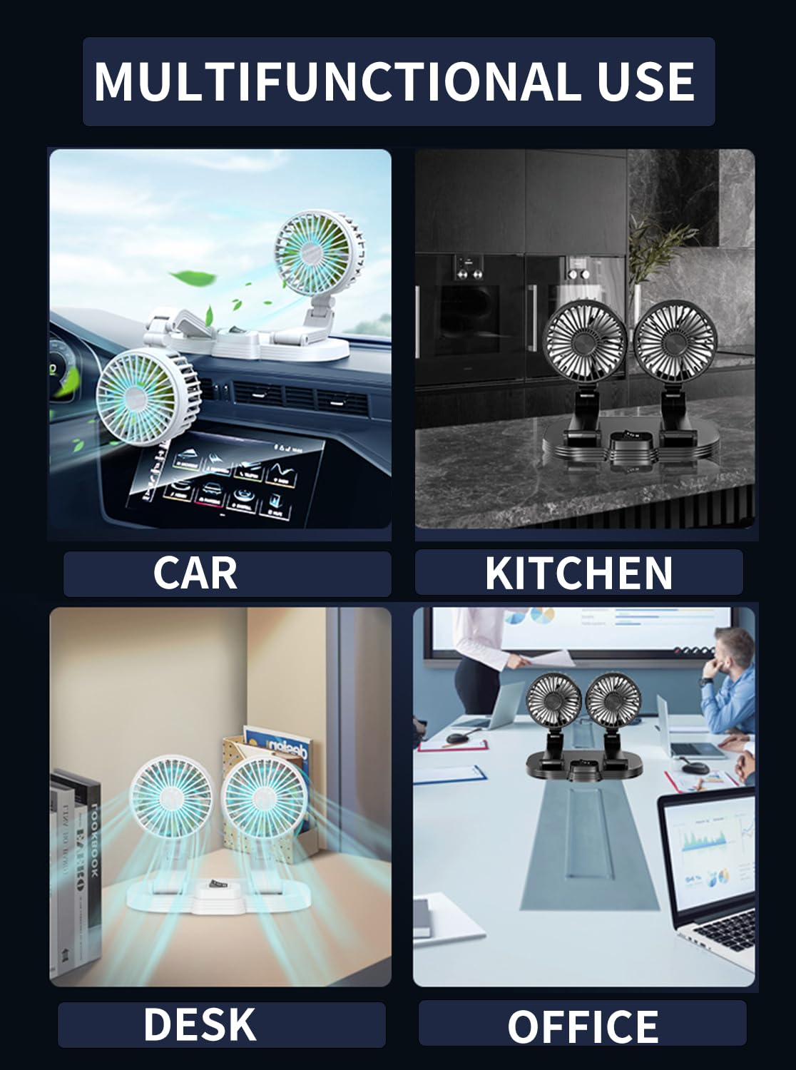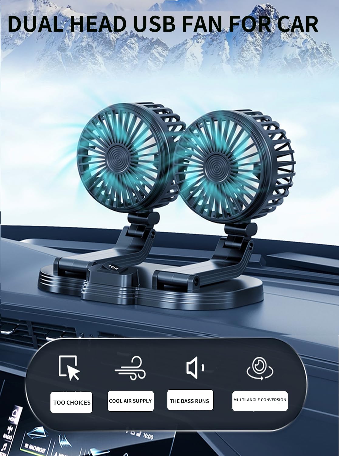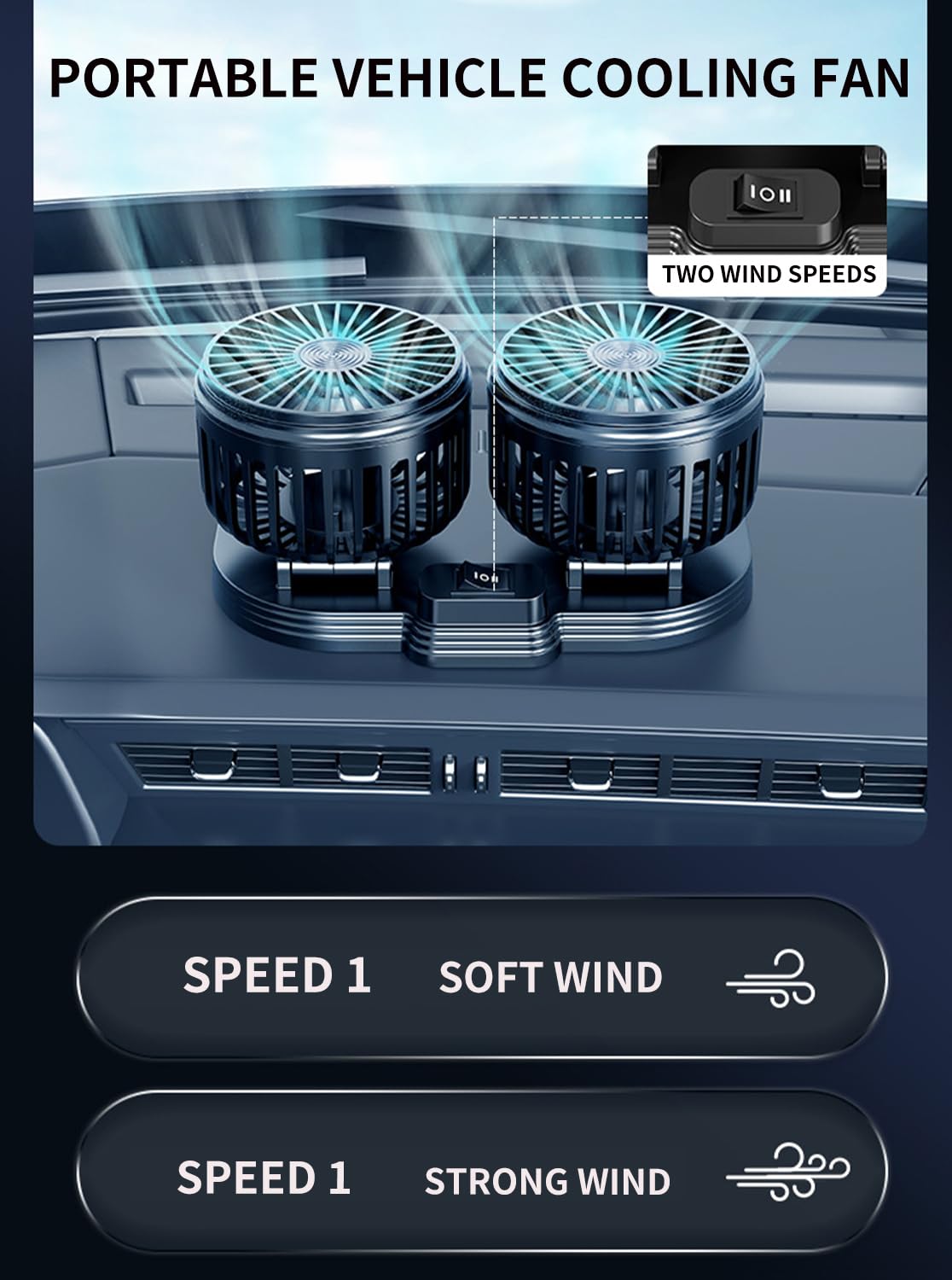 Q: Is the car fan adjustable for airflow direction?A: Yes, the dual-head design allows both fans to rotate 360° vertically and horizontally, ensuring cool air reaches every corner of your vehicle.