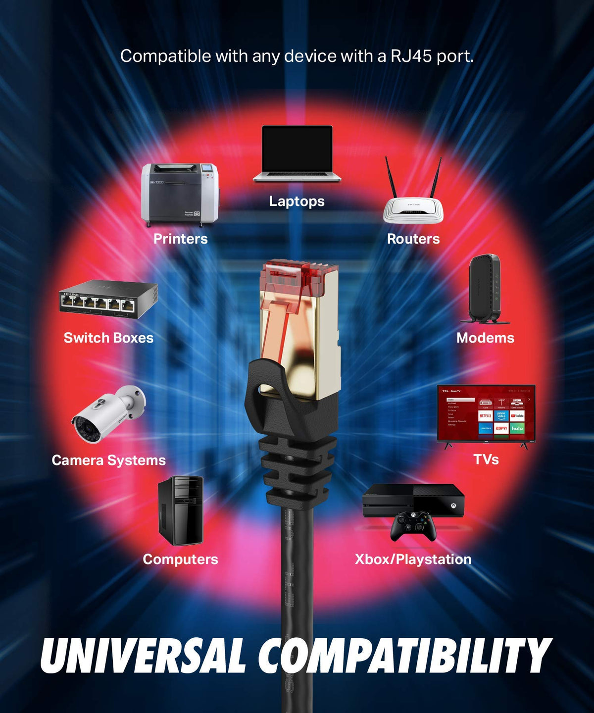 Product Description:For Those Who Want To Future-Proof Their Smart Home Or Commercial Network As Much As Possible Without A Significant Cost Increase, The Cat 8 Internet Cable Is A Great Choice. Surf The Net, Play Video Games, Stream Music, Video, And Other Data At Greater Speed.Cat8 Cables Are Used For Wired Home And Office Networks, Data Transfer And Phone Lines, And Have Been Designed Specifically For Gigabit Ethernet Applications. They Perform At High-Data Transfer Rates, Provide Exceptional Transmission Performance , Support Frequencies Of Up To 2000 Mhz, And Are Suitable For High-Speed 10Gbase-T Internet Connection For Lan Network Applications While Remaining Backward Compatible With Your Existing Network.The Cat8 Ethernet Cable Features 8 Stranded Bare Copper Conductors, Individual Foil Shielding Between The Twisted Pairs, And Is Shielded With An Outer Foil And Mesh Braiding To Prevent Crosstalk And Protection From Electromagnetic Interference (Emi) And Radio Frequency Interference. Its Covered With A 5.8Mm Pvc Jacket And Has Rj45 Connectors With Gold-Plated Contacts.The Cable Is Ul Listed, Complies With Tia/Eia 568-B.2, Is Etl Verified And Rohs Compliant.Ultra Clarity Cables Are Backed By A Limited 1-Year Warranty Should Any Issue Arise. For Questions Or Concerns Please Contact Our Friendly, Usa-Based Customer Support Team.Specificationsconnector Type: Rj45Compatibilitywith Two Shielded Rj45 Connectors At Both Ends, The Cat8 Ethernet Cable Works Perfectly With Networking Switch, Ip Cam, Routers, Adsl, Adapters, Modem And Other Device With Rj45 Connectors. Also Compatible With Cat7/Cat5/Cat5E/Cat6/Cat6E.