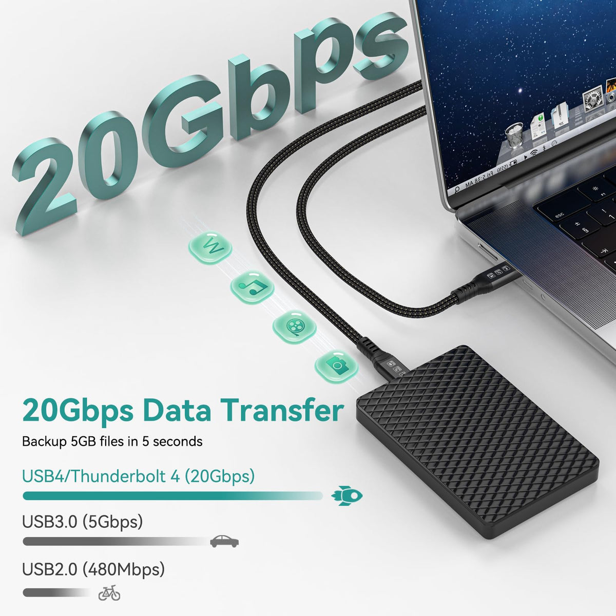 Q: What is the data transfer speed of this Thunderbolt cable?A: This Thunderbolt cable offers an impressive data transfer speed of up to 20Gbps, allowing you to transfer large files quickly, such as 12 hours of HD video or 20,000 HD photos in just one minute.