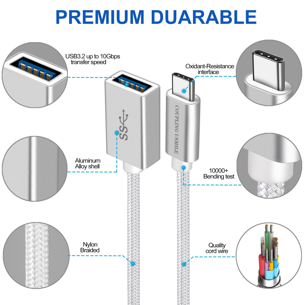 The Usb Type-C To Usb 3.2 Gen1 Female Adapter.Coupling Usmile Female Usb To Usb C Adapter Adopts Tin-Plated Usb Receptacles And Gold-Plated Pins.The Pins Are Corrosion-Resistant And More Durable For Plugging And Unplugging Of Your Usb Devices. The Connectors Make Tight Connection And Stable Transmission.Optimal Usb 3.2 Gen1 Syncing,Superspeed Usb 3.2 Gen1 Provides Up To 10Gbps Data Transfer Speed,Outstanding & Unique Construction For Long Service Life,Coupling Usmile High Density Quality Aluminum Shell Of This Otg Adapter Has Also Undergone A Fatigue Test Of Bending And Has Been Proven To Be Suitable For Your Usage. It Is Characterized By Heat Dissipation, Anti-Corrosion, Oil Resistance And Acid & Alkali Resistance.Compatibility: Coupling Usmile Usb Female To Usb C Male Adapter Is Designed For Usb-C Devices To Work With Usb-A Accessories, Like Usb Cables, Flash Drives, Keyboard, Mouse And Other Peripherals.Compatible Devices (Incomplete List): Macbook Pro 2016/2017, 15Inch&13Inch, Macbook 2015/2016/2017, Imac, Imac Pro 2017, Chromebook Pixel, Pixel Book, Dell Xps 2018, Lenovo Miix 630, Hp Spectre X360/Envy X2, Acer Swift7 Asus Zenbook 13 Lg Gram 13, Smartphones: Samsung Galaxy S8/S8 Plus/S9/S9+/Note9/S9 Mini/Note8/Book/Notebook 9, Google Pixel2/Pixel2 Xl, Oneplus 1/2/3/3T Oneplus 5/5T, Moto Z2 Play/G5 Plus/E4, Lg G7/V30, Huawei Mate 10/P11.