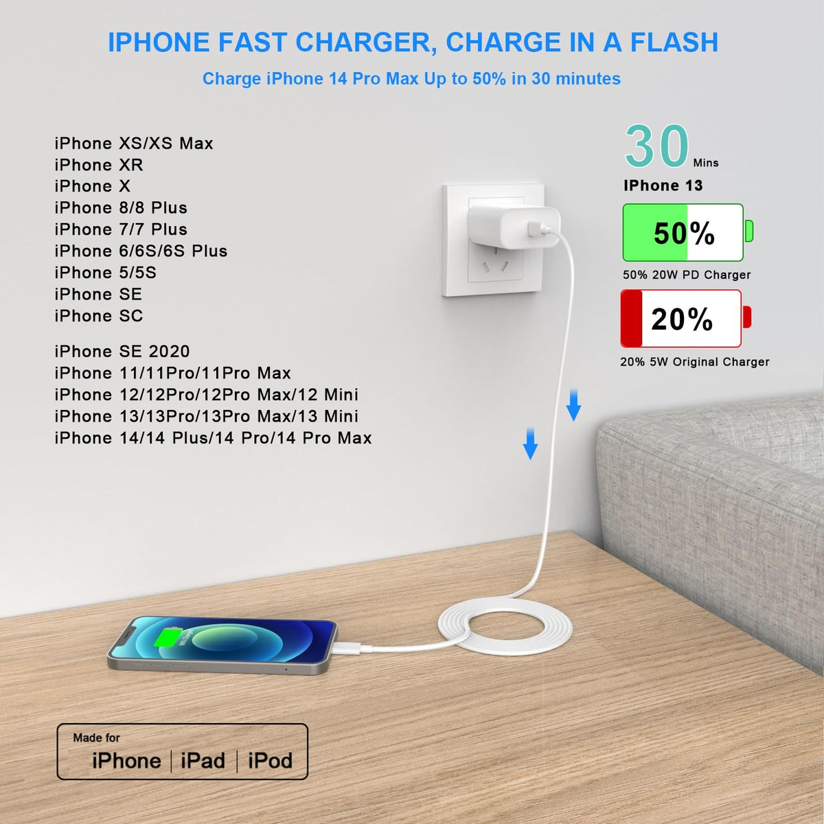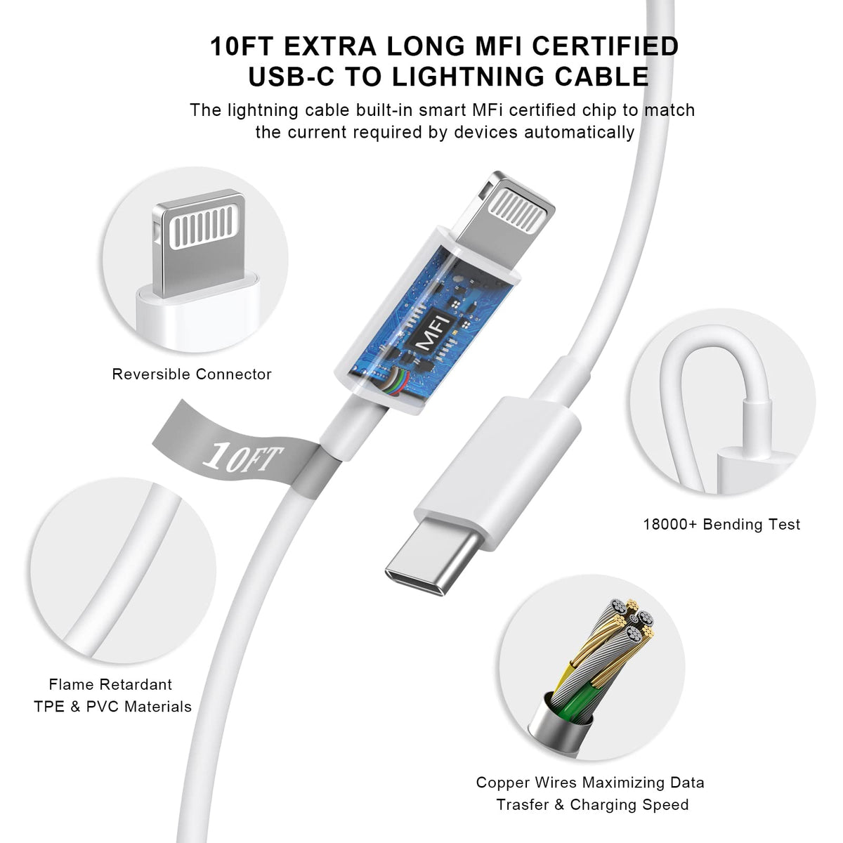 Pd 20W Usb-C Power Adapter & 10Ft Long [Mfi Certified] Usb-C To Lightning Cable Product Specifications 20W Usb C Power Delivery Fast Charger Mfi Certified Chipc94 Terminal Cable Length: 10Foot/3Meters Input Voltage: 100-240V ~ 50-60Hz, 0.5A Output Power: 5V/3A, 9V/2A, 9V/2.22A, 12V/1.5A Certifications: Mfi/Ul/Etl/Fcc/Ce/Rohs 20W Power Delivery Fast Charger: Compatible With Iphone 13/13 Mini/13 Pro/13 Pro Maxcompatible With Iphone 12/12 Mini/12 Pro/12 Pro Maxcompatible With Iphone 11/11 Pro/11 Pro Maxcompatible With Iphone Se 2020/Xs/Xs Max/Xr/X/8/8 Plus Compatible With Ipad Pro 10.5''/Ipad Pro 11''Compatible With Ipad Mini 5 7.9'' And Later Models Pad Pro Standard Charge Speed: For Iphone 7/7 Plus/6/6 Plus/6S/6S Plus/5/5C/5S/Se/For Pad Air/For Pad Mini, Pad Pro 9.7'' And More. 3.0X Faster Charging 20W Usb C Iphone Fast Charger With 10Ft Type C To Lightning Cord, Charges Iphone 12/13 Up To 50% In Just 30 Minutes, Save Your Time. Built In High-Tech Chip The Updated Smart Chip In The Usb-C Power Adapter Protects Your Iphone/Pad From Overcurrent, Over-Voltage, Short-Circuit, And Overheating, Ul/Etl-Certified 20W Usb C Iphone Charger Ensures Fast Charging Efficiency And Security While Also Protecting Battery Life. 10Ft Extra Long Cable The 10Ft Iphone Fast Charger Cable Is Ideal For Varied Occasions, You Can Use Your Devices While Charging With An Adapter In Your Bedroom, Kitchen, And In The Backseat Of Your Car. Mfi Certified C To Lightning Cable 1. Original C94 Connector And Mfi Certified Chip, Build Double Protection For Your Iphone Or Pad. 2. Connect Your Mac-Book/Pro With Iphone/Pad Directly And Enjoy The 480 Mbps Data Transfer Speed. What You Get 1 * 20W Pd 3.0 Usb C Wall Charger 1 * 10Ft Long Mfi Certified C To Lightning Cable