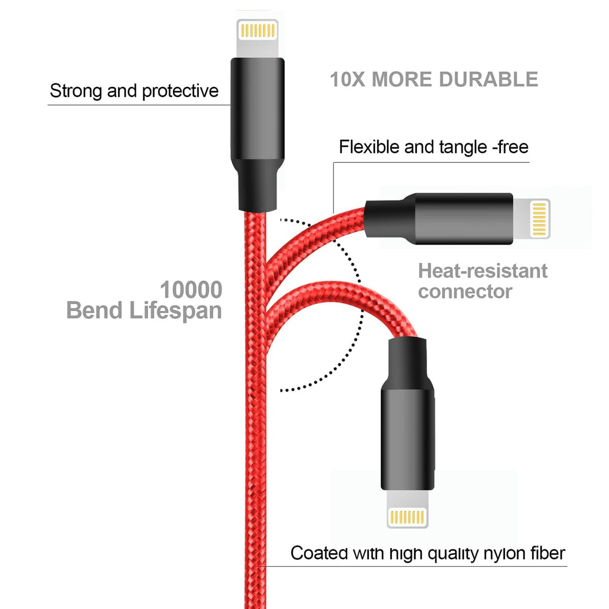 Cugunu Iphone Charger, 5 Pack 3/3/6/6/10Ft Apple Mfi Certified Usb Lightning Cable Nylon Braided Fast Charging Cord Compatible For Iphone 14/13/12/11/X/Max/8/7/6/5/Se/Plus/Ipad Red