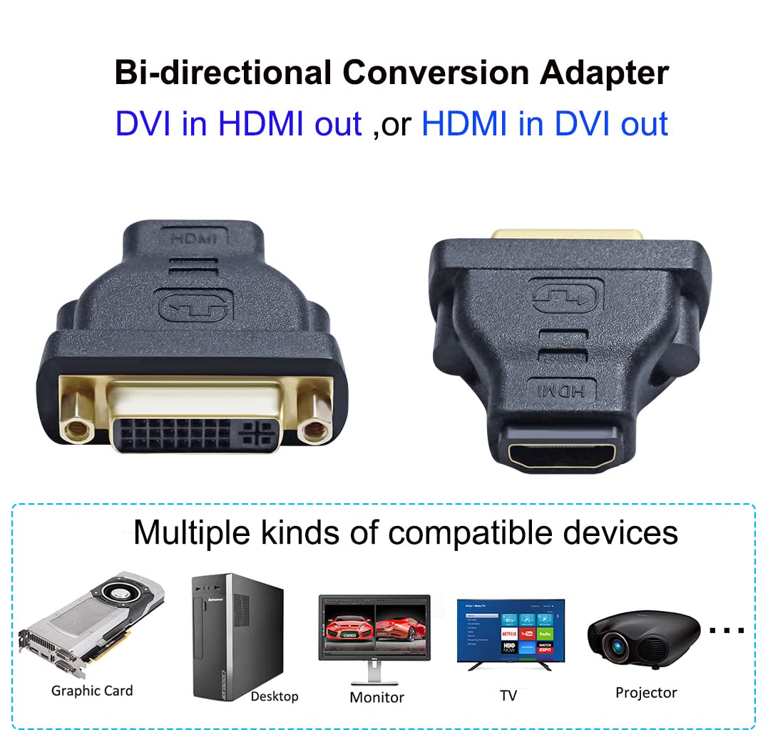 Bi-Directional Hdmi-Dvi Conversion Dongle: Supports Hdmi In Dvi Out, Or Dvi In Hdmi Out If Your Tv Only Has Vga And Dvi Inputs, But Your Ps4 And Video Card Use Hdmi, Then This Small Hdmi To Dvi Adapter Is A Great Simple Solution For You. Gold Plated Dvi To Hdmi Adapter Is Bidirectional That You Can Connect A Hdmi Computer To Dvi Monitor, Or Transmit High Quality Signals From A Dvi Desktop Computer To Hdmi Projector. Compatibility: The Hdmi Female To Dvi-I Female Connector Dongle Will Fit In Both Dvi-D Male (24+1) And Dvi-I Male (24+5) Port Note: Dvi Does Not Natively Support Audio. So, If You Need Audio Output, You May Need An Hdmi Extractor (Not Included). Specific: Interface A: Hdmi Female Socket Interface A: 24+5 Pin Dvi-I Female Socket Max Resolutions Supported: 4096 X 2160@30Hz Drivers Free, Plug And Play Whats Included: 1 X Black Hdmi To Dvi Adapter