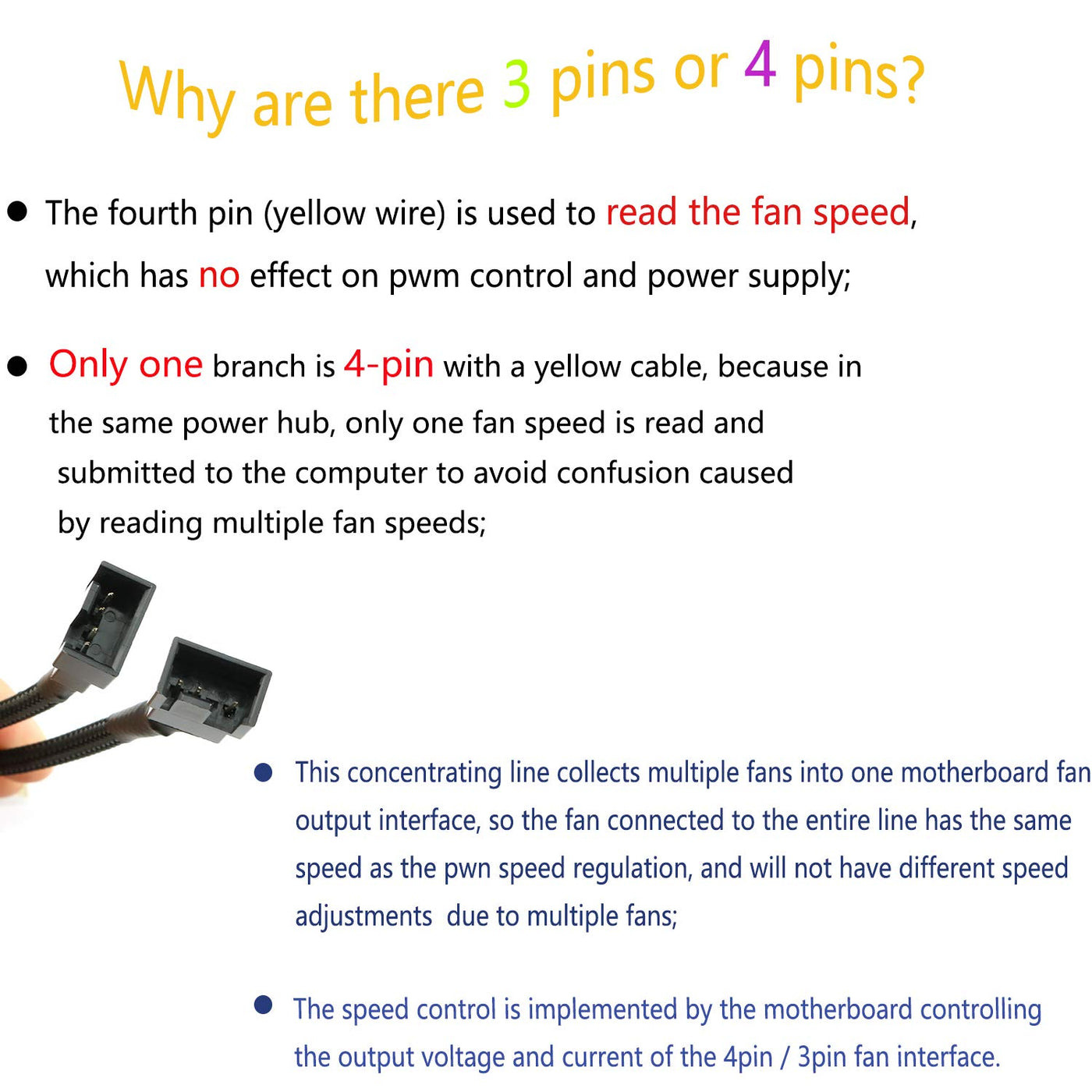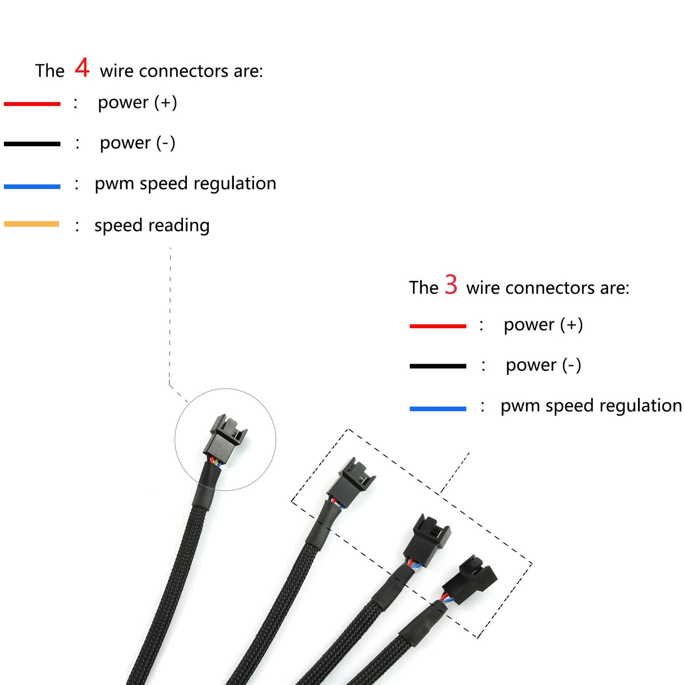 Feature: Name: 4Pin 1 To 4 Ways Pwm Fan Splitter Cable Connector: 1X Mainboard 4Pin Female Socket 4X Fan 4Pin Male Plug (4Pin: Power Supply, Speed Control, Speed Detection, 3Pin: Power Supply, Speed Control) Length: 27Cm/10.5'' Cable: 1007 24Awg, High Density Black Sleeved Cable Insulation Material: Pvc Conductor: 11X0.12Ts Conductor Material: Tinned Copper Wire Diameter: Od1.4Mm Rated Temperature: 80 Degree Color: Black Function: Make The Computer Fan Share An Interface To Realize Power Supply And Pwm Speed Control, Lengthen And Extend The Motherboard 4Pin Interface. 4Pin Male Splitter Wire Connection: 4Pin: Blue, Yellow, Red, Black 3Pin: Blue, Red, Black Package Include: 1Pcs 4Pin 1 To 4 Ways Pwm Fan Splitter Cable