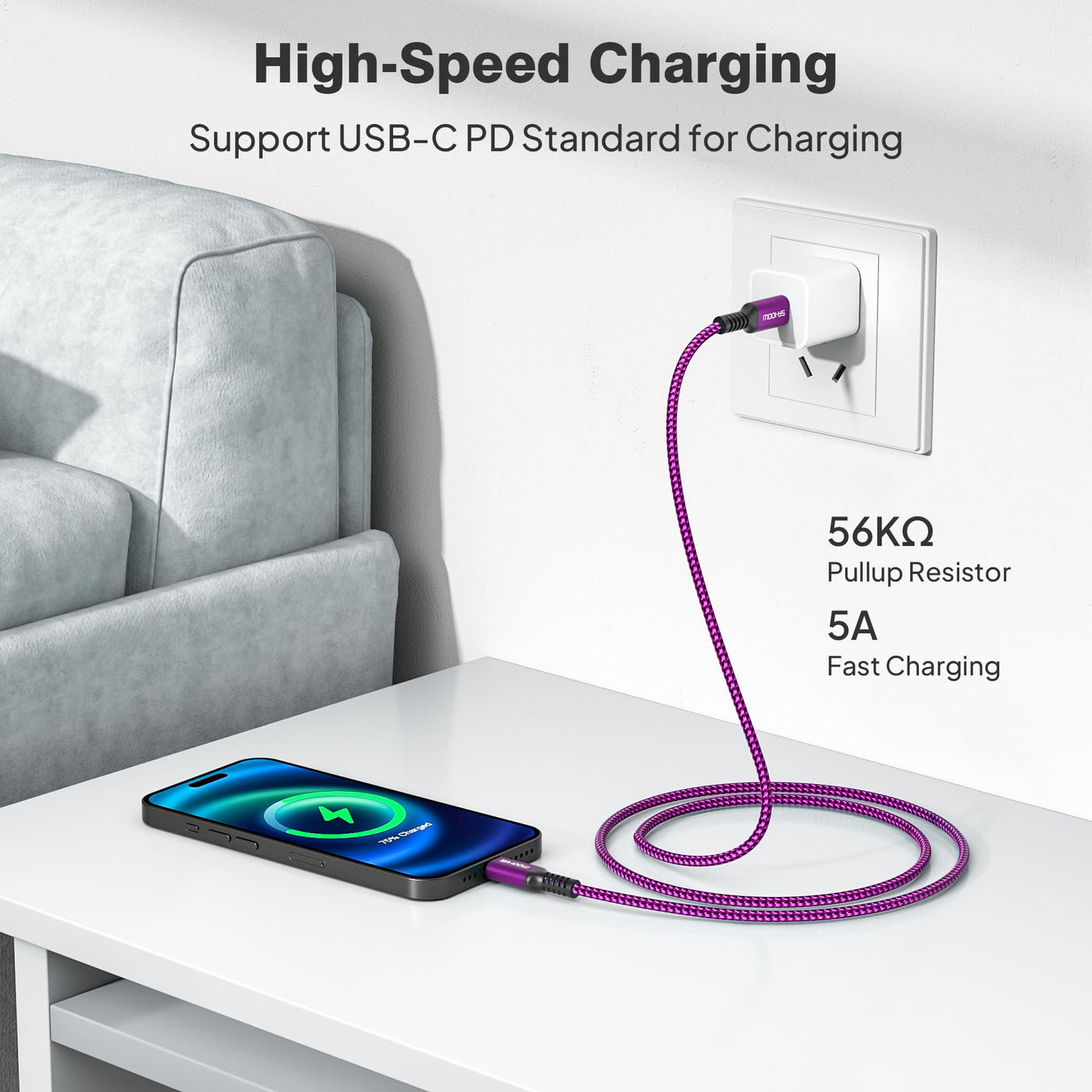 Q: What is the maximum charging speed of this cable?A: This charging cable supports up to 100W Power Delivery, allowing for fast charging of compatible devices, making it ideal for quick power-ups whether at home or on the go.
