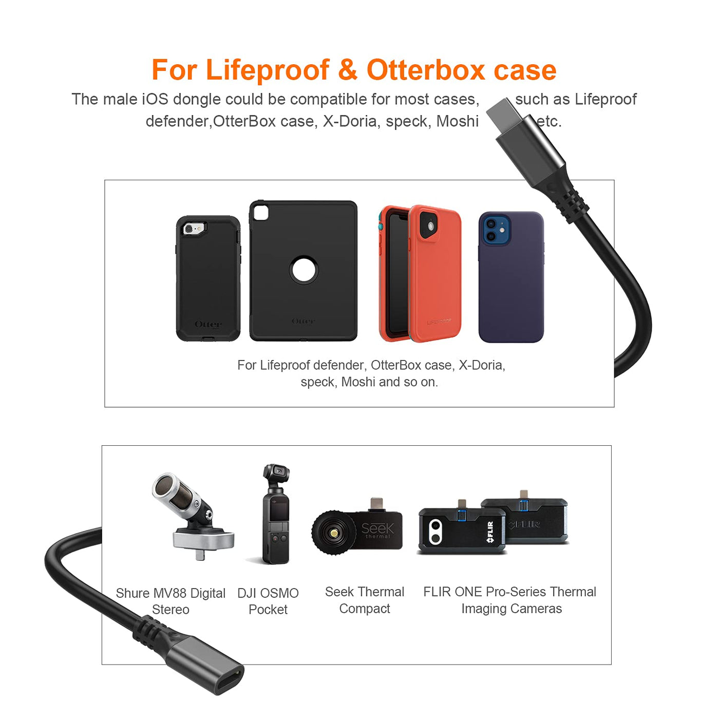 Q: What devices are compatible with the EMATETEK i-Phone Extension Connector Cable?A: The EMATETEK i-Phone Extension Connector Cable is compatible with a wide range of i-OS devices, including i-OS Phone models such as 13 Pro Max, 13 Pro, 12 Pro Max, and many others. It also works with i-OS tablets like the iPad mini and iPad Air, as well as compatible accessories like FLIR ONE Personal Thermal Imager and various audio devices.