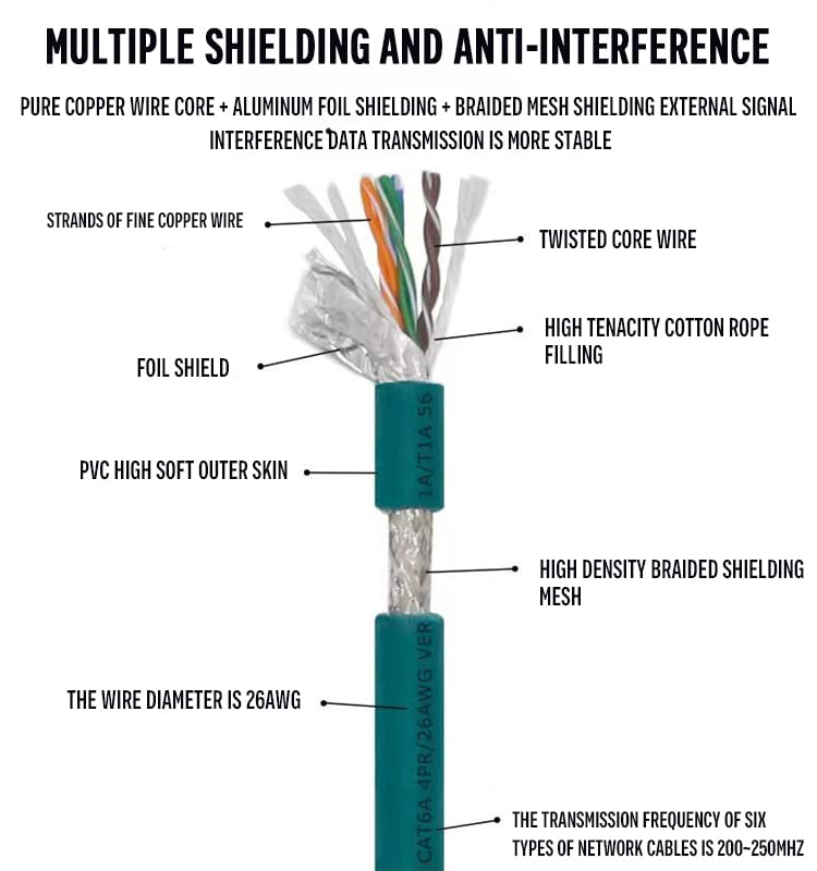 Q: What materials are used in the construction of the Eonvic Ethernet cable?A: The Eonvic Ethernet cable features a shielded design with an overall shield made of tinned copper braid and stranded wires made from 24AWG copper, ensuring durability and effective electromagnetic shielding.