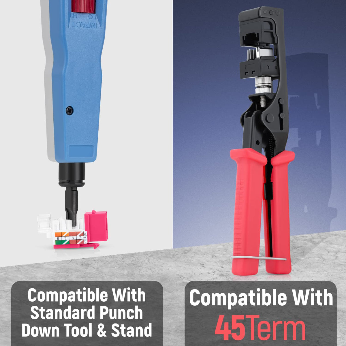 Q: What is the compatibility of the Everest 45° Angled RJ45 Cat6 Keystone Jacks?A: The Everest 45° Angled RJ45 Cat6 Keystone Jacks are compatible with standard patch panels, wall plates, and surface mount boxes that have keystone ports. They also work seamlessly with the Everest Media Solutions 45Term speed termination tool and can be used with standard punch-down tools.