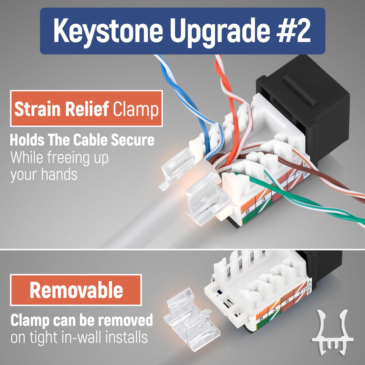 Q: How do I install the Everest RJ45 Keystone Jacks?A: To install the Everest RJ45 Keystone Jacks, start by cutting off the cable jacket and separating the wires according to color code. Next, push the wires into the keystone jack, cut off any excess wires, and snap the jack into your faceplate. This process is straightforward and can be completed with minimal tools.