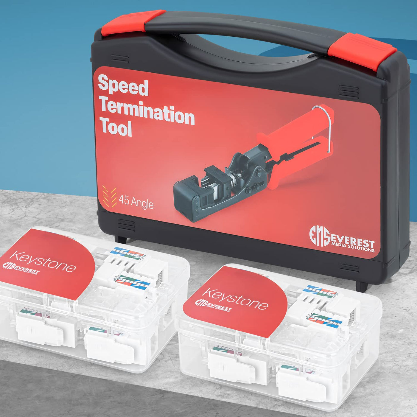Everest Media Solutions 45Term 45 Angled Speed Termination Tool With 20 Pack Of 45 Angled Cat6A Keystone Jacks In White Colo