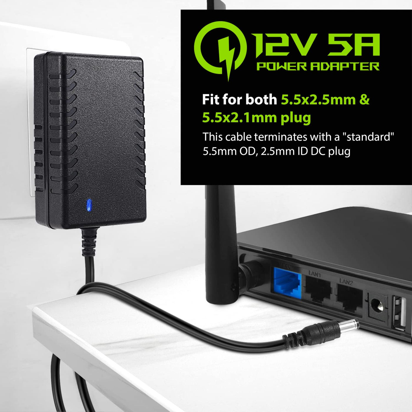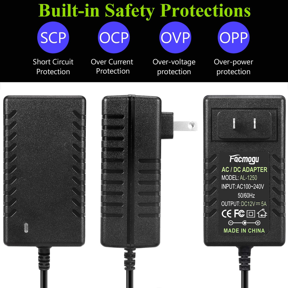 Facmogu 12V 5A Power Supply Adapter, Wall Adapter With 150Cm/ 4.92 Feet Long Cable, Wall Plug Transformers Ac 100 240V To Dc 12V Converter Available 5.5Mm X 2.5Mm & 2.1Mm Output Jack For Cctv