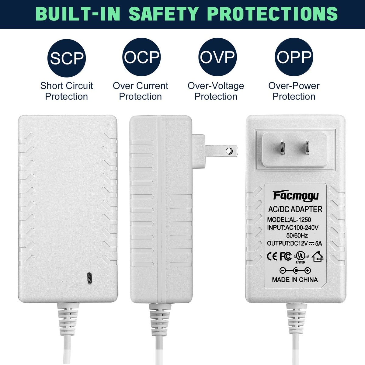 Q: How do I determine if this power adapter is suitable for my device?A: To determine if the Facmogu power adapter is suitable for your device, check the voltage and current requirements typically found on the device itself. Ensure that your device requires a 12V output and the current does not exceed 5A, as this adapter is rated for up to 60W.