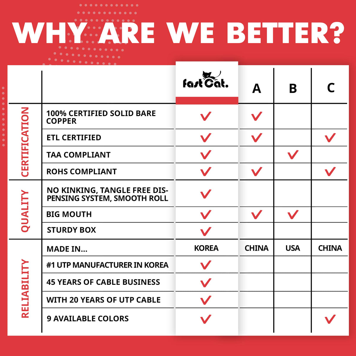 Ethernet Cables Aren�T Very Interesting To Talk About ... But The Cat 6 Cable By Fast Cat. Is! It�S Time To Upgrade Your Ethernet Cable, And Of Course The Choices Are Endless. And While It May Seem Most Cat6 Ethernet Cables Are The Same, Only Fast Cat. Pays Attention To The Little (But Important) Things. Take The Spool For Example. It May Seem Like A Small Thing When It Comes To Cable Performance, But This Is A 1000Ft Bulk Ethernet Cable, And It Needs To Roll Smoothly Without Snags - Otherwise Installation Just Takes Extra Time And Frustration, Right? And Notice The Pvc Cross Separator Inside. It Stops Cross-Talk Dead In Its Tracks For Clear Transfer Of Data Packets - Crucial For Those Moments Where Every Second Counts, Like Gaming, Real-Time Stock Alerts, The Rush Of Business And The Important Netflix And Chill! And Finally, You Can Forget Copper Clad Aluminum Cables (Cca) - With A Higher Conductivity And Tensile Strength, Our Bare Copper Conductors Transmit Faster While Being More Durable. So, With That Being Said - Meet Your New Fast Cat., Cat6 Cable Outer Cable Diameter: 6.1Mm / Length: 1000 Feet Superior Conductor: 23Awg Solid Bare Copper Wire Safe, Durable Insulation: Polyethylene Noise-Less Cable Lay-Up: 4 Twisted Pairs With Varied Pitches And Pvc Cross Separator High Performance: 550Mhz / 10 Gigabit Certified: Csa, Etl And Cmr Flame-Resistant Iec 60332-3 Certified, Taa And Rohs Compliant Twisted Pair Color Code: Blue/White Blue, Orange/White Orange, Green/White Green And Brown/White Brown Poe: Ieee 802.3Af, Poe+-Ieee 802.3At Type 1 And 2, Atm And Token Ring When You Order Now, You�Ll Be Joining Thousands Of Companies Around The World Who Rely On Fast Cat. Cat 6 Cables. So, If It�S Time To Upgrade - Do It Faster, With Fast Cat..