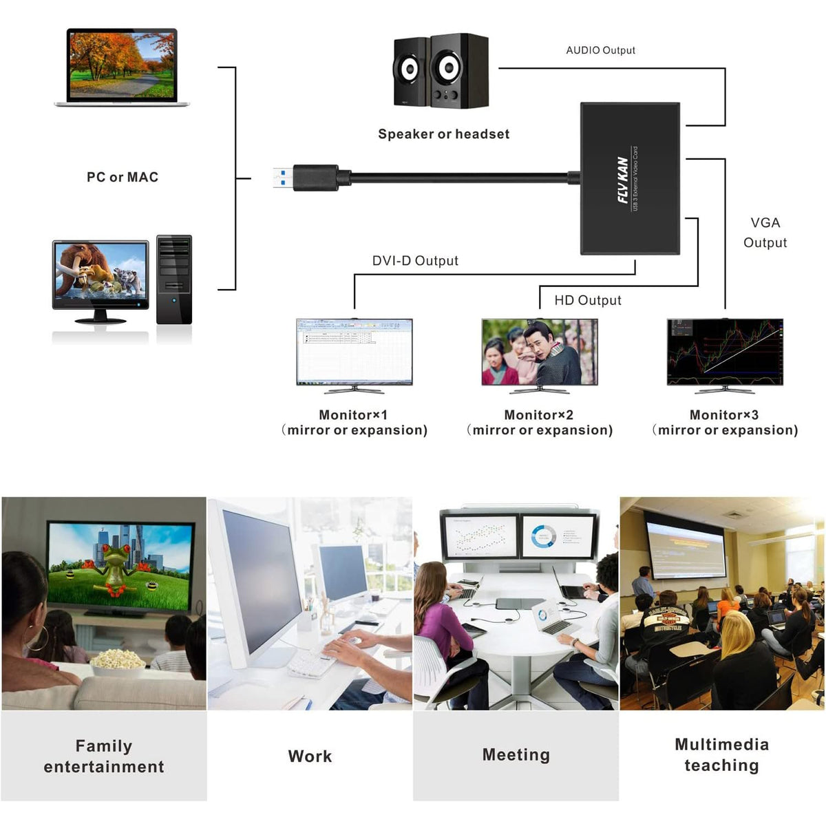 Fly Kan Usb 3.0 To Hdmi Dvi Vga Video Graphics Card Adapter For Multiple Monitors Add Hdmi And Dvi D Or Hdmi And Vga ( Windows