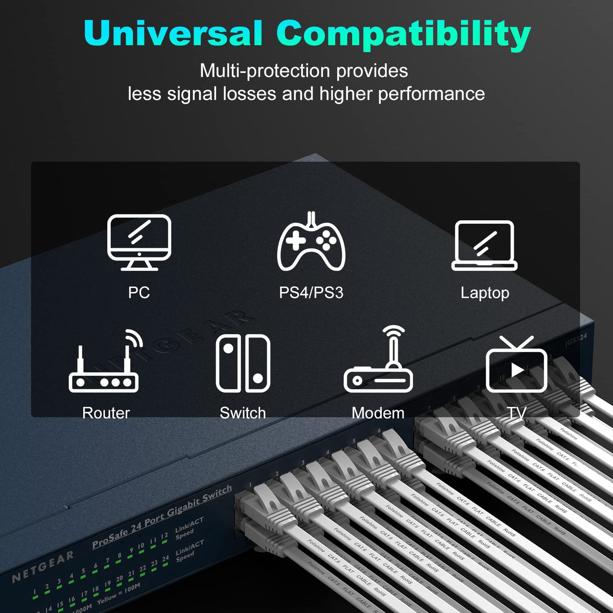 Q: What devices are compatible with the Folishine Cat 6 Ethernet Cable?A: The Folishine Cat 6 Ethernet Cable is compatible with various devices including routers, modems, Ethernet network switches, PCs, computer servers, printers, network media players, NAS, and VoIP phones. It is also backward compatible with Cat 5 and Cat 5e cables.