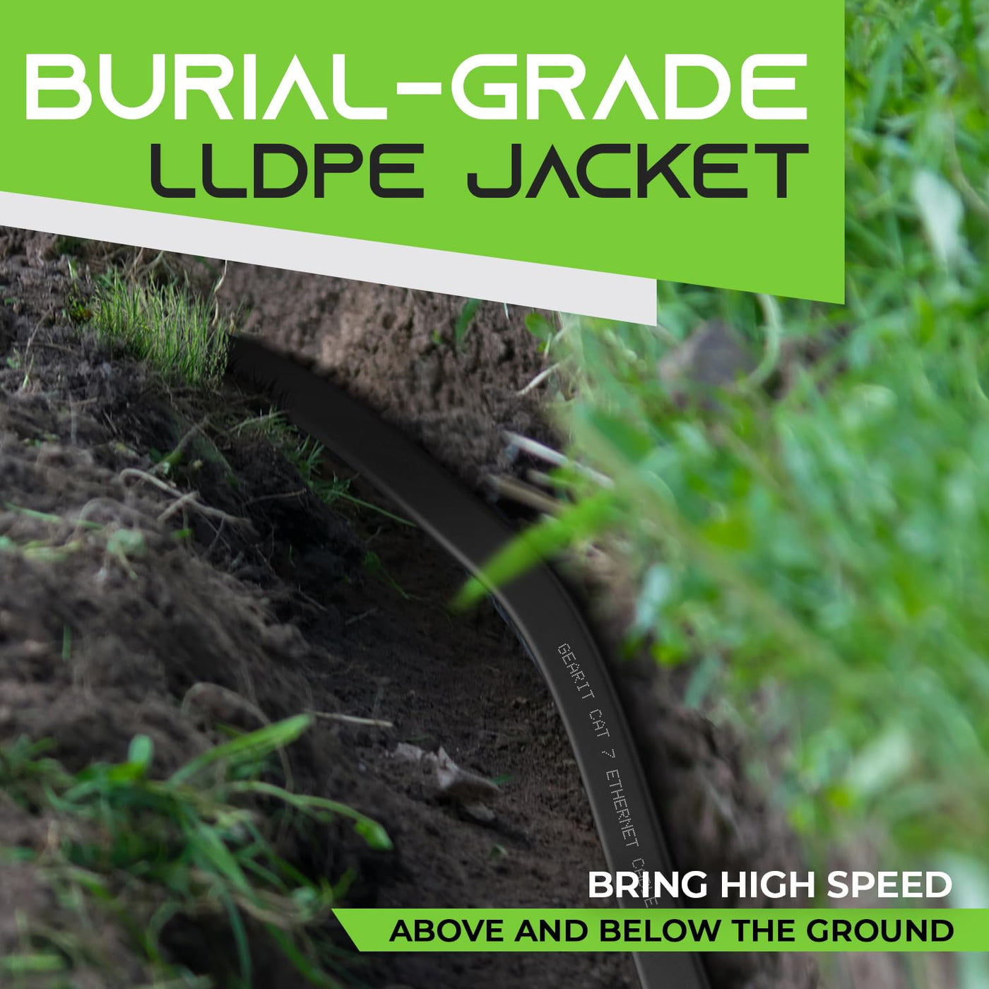 Q: What makes the GearIT Cat 7 Ethernet cable suitable for outdoor use?A: The GearIT Cat 7 Ethernet cable features a UV, weatherproof, and direct burial-rated LLDPE jacket that is specifically designed to withstand harsh outdoor conditions, making it ideal for outdoor and direct burial installations.