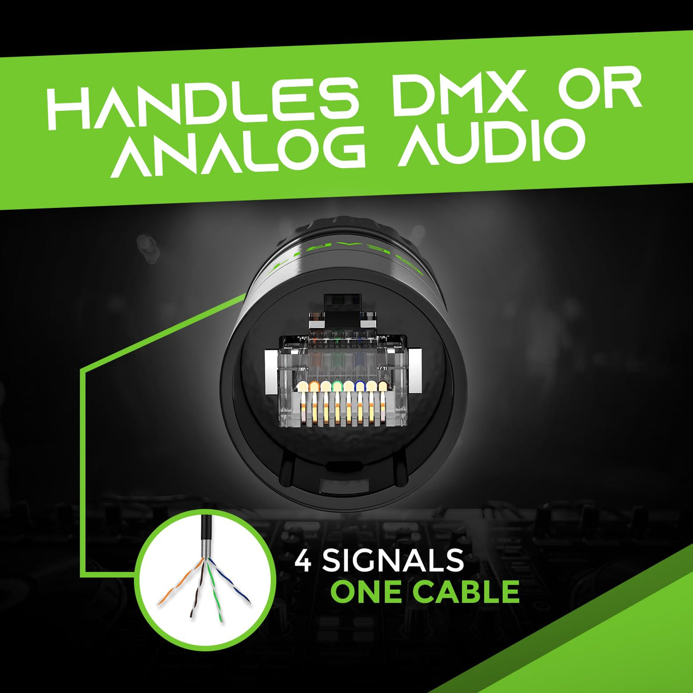 Q: Is this Ethernet cable compatible with DMX signals?A: Yes, the GearIT CAT6 Ethernet Cable can carry up to 4 DMX or XLR audio signals when used with a compatible GearIT extender. This capability makes it perfect for linking stage lights and audio equipment, providing reliable performance in demanding environments.