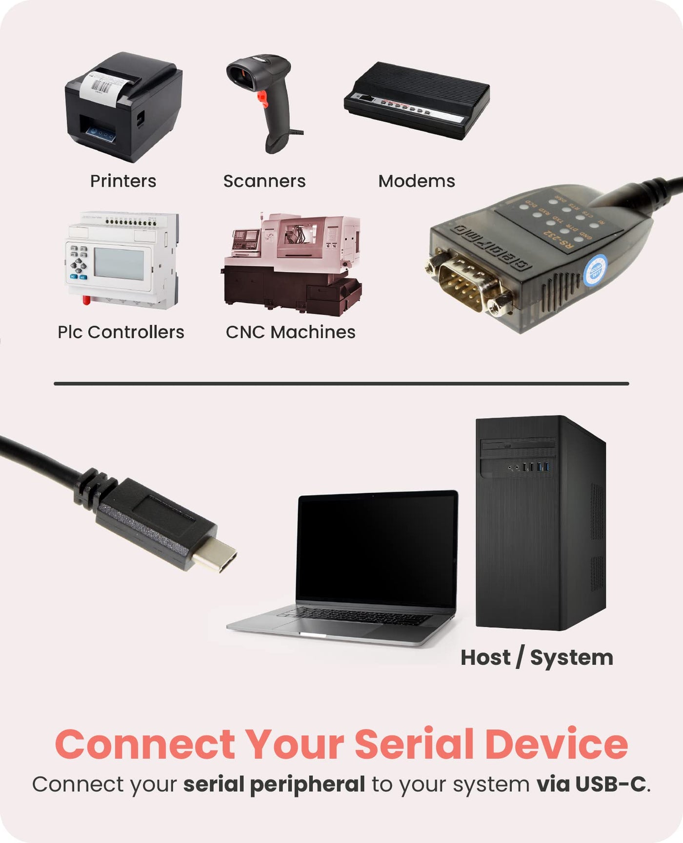 Usb C To Rs232 Serial Adapter For Windows 11This Usb Serial Device Is A Usb C To Rs-232 Serial Adapter Compliant With Usb 2.0 Specifications, Used To Easily Add A Serial Port To Your Computer Even If They Are Unequipped With Com Port Ability.It Supports Peripherals Requiring A Serial Rs-232 Connection Through A Usb C Type Host Port Connection From Your Laptop Or Desktop Computer. The Usb C To Serial Adapter Allows You To Add A Single Serial Port And Monitor The Status Of Your Connections By Using Led Activity Flashes.The Led'S Will Flash Letting You Know You Have Signal On The Pins. The Usb C To Serial Adapter Offers An Advanced An Ftdi Chipset Supported By Windows 11 And Is Powered Individually By The Usb 2.0 Type-C Port. It Easily Tests Rs-232 Host To Device Link With Backward Compatibility With Usb Spec 1.1.Device Supportsupports Reversible Usb Type-C Connection Only, Can Not Be Connected To Any Other Usb Port.Pda Rs-232 Port Support 56K Modem Support Serial Mouse Support+ Serial Pc Camera Support.Fully Compliant With Usb Spec 2.0 Compliant Usb Spec1.1.Rs-232 - Db9 / M Data Rate : Over 1000Kbps.Esd Protection For Rs-232 I/O' +-15Kv Rs-232 For Dte Modeos Support: Win Xp, Vista, 7, 8, 10, And Windows 11, Linux, And Mac Os.Xadditional Features:Led Color:1~4, 6~9 Pin Signal 0 : Green / Signal 1 : Red Gnd - Red - Power Ps. Db9-F Pin / 1,2,6,8,9 No Input Led No Lightdcd , Rxd, Txd, Dtr , Gnd,Dsr ,Rts ,Cts , Rieasy Test Rs-232 Host To Device Linksupports Usb C Port Connectionpackage Contents:Usb C To Rs232 Serial Adapter With Led'Slatest Ftdi Driver (On Disk)Gm-Ftdi2-Led Product Manual (On Disk)